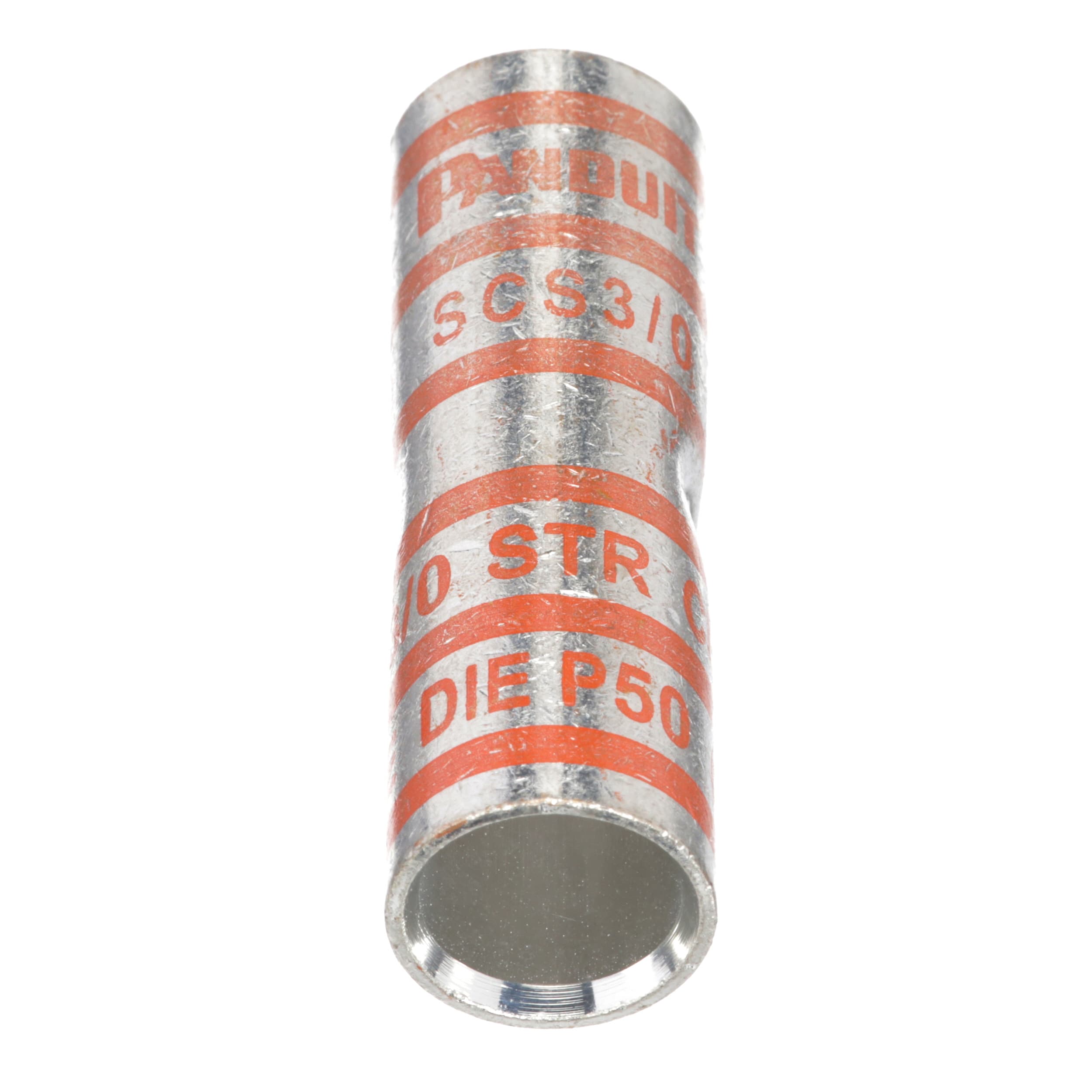 The SCS3/0-X Copper Compression Lug Lug, standard barrel, has color-coded barrels marked with Panduit and specified competitor die index numbers for proper crimp die selection. An inspection window aids to visually assure full conductor insertion, and the tin-plate material helps to inhibit corrosion. UL Listed and CSA Certified to 35 KV and temperature rated to 90°C.
