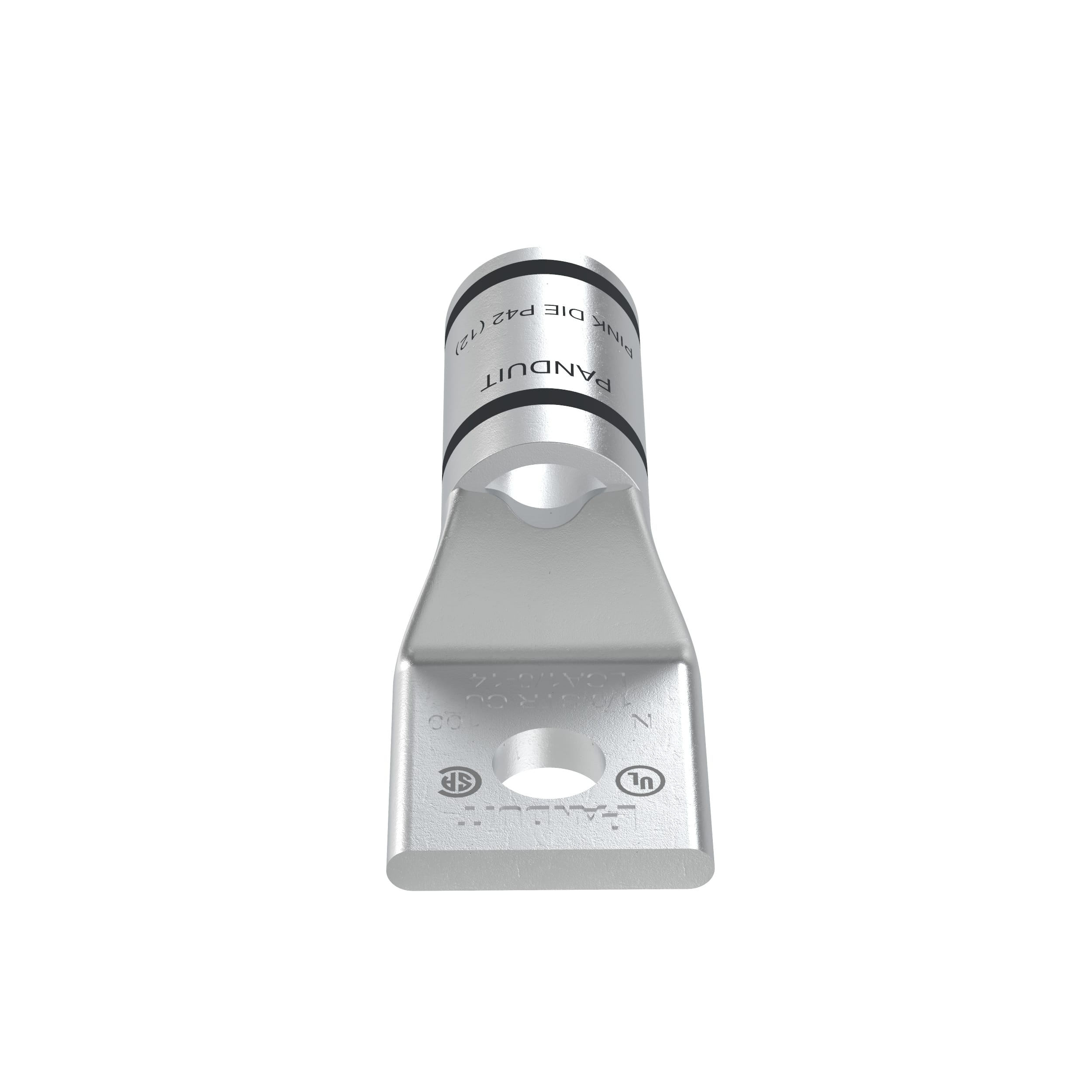 The LCA1/0-14-X Tin-Plated Copper Compression Lug, one-hole, standard barrel, has color-coded barrels marked with Panduit and specified competitor die index numbers for proper crimp die selection. An inspection window aids to visually assure full conductor insertion, and the tin-plate material helps to inhibit corrosion. UL Listed and CSA Certified to 35 KV and temperature rated to 90°C.