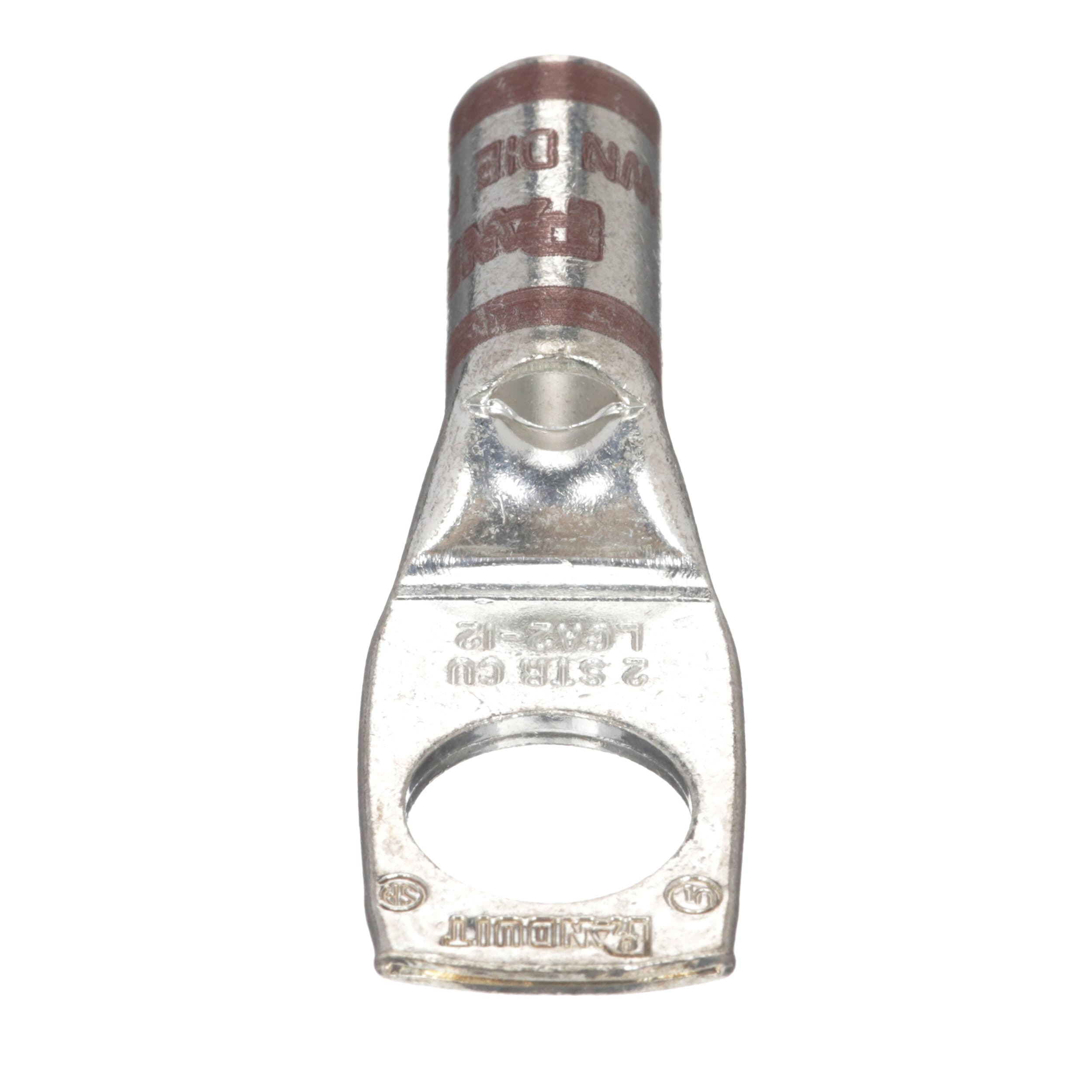 The LCA2-12-Q Tin-Plated Copper Compression Lug, one-hole, standard barrel, has color-coded barrels marked with Panduit and specified competitor die index numbers for proper crimp die selection. An inspection window aids to visually assure full conductor insertion, and the tin-plate material helps to inhibit corrosion. UL Listed and CSA Certified to 35 KV and temperature rated to 90°C.