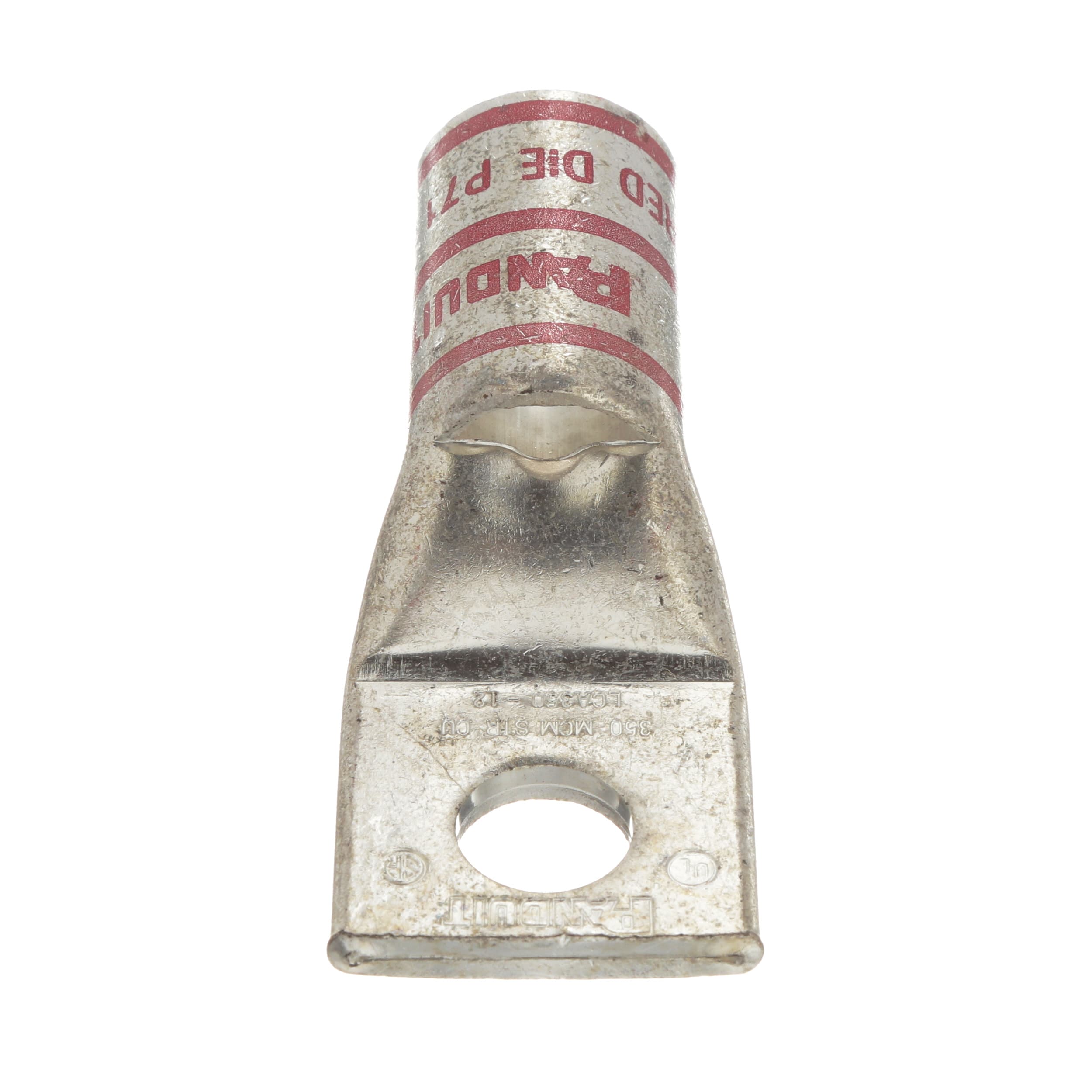 The LCA350-12-X Tin-Plated Copper Compression Lug, one-hole, standard barrel, has color-coded barrels marked with Panduit and specified competitor die index numbers for proper crimp die selection. An inspection window aids to visually assure full conductor insertion, and the tin-plate material helps to inhibit corrosion. UL Listed and CSA Certified to 35 KV and temperature rated to 90°C.