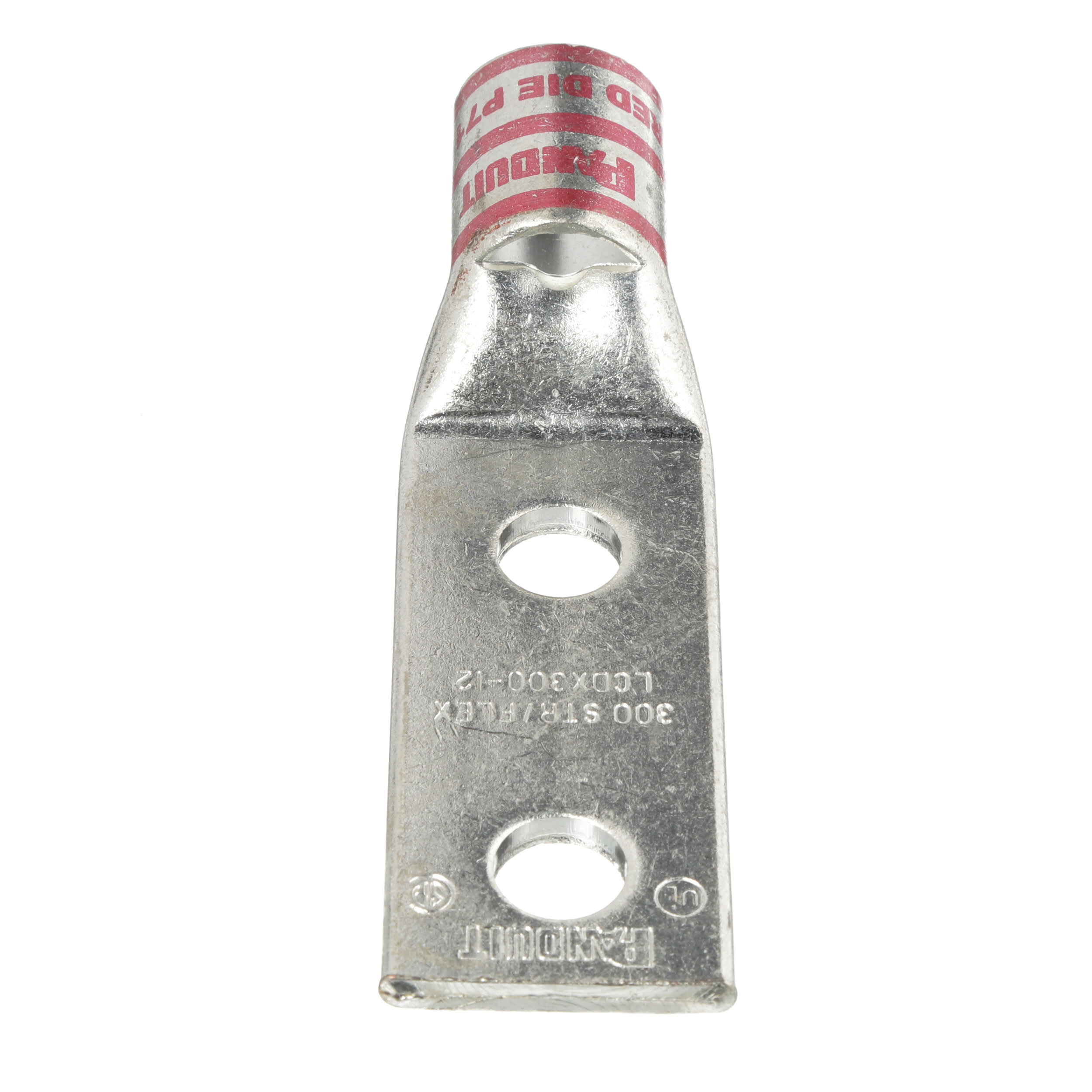 Two-hole, flex lug, 300 kcmil cable, 1/2 stud hole, 1.75 hole spacing.