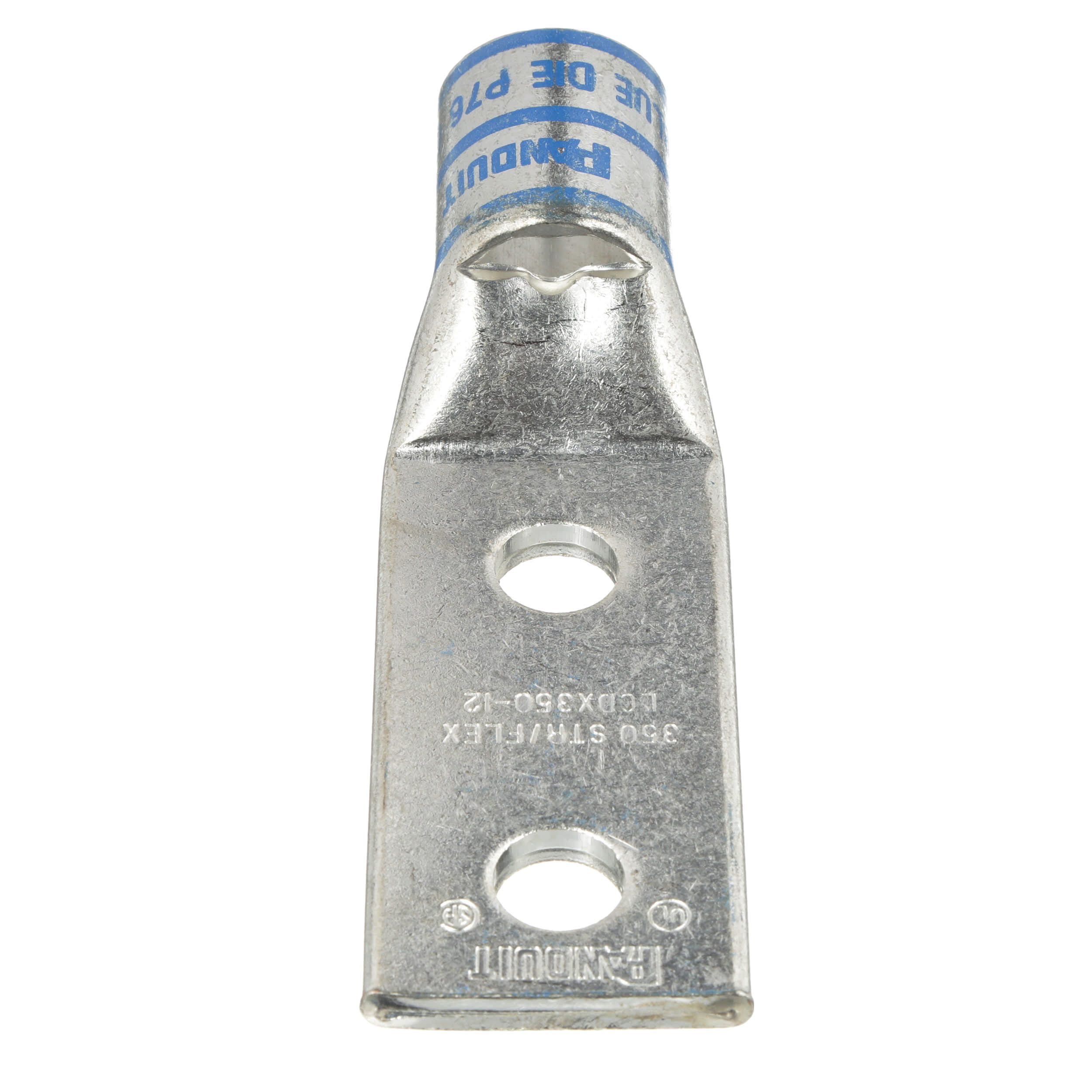 The LCDX350-12-6 Tin-Plated Copper Compression Lug, two-hole, standard barrel, has color-coded barrels marked with Panduit and specified competitor die index numbers for proper crimp die selection. An inspection window aids to visually assure full conductor insertion, and the tin-plate material helps to inhibit corrosion. UL Listed and CSA Certified to 35 KV and temperature rated to 90°C.