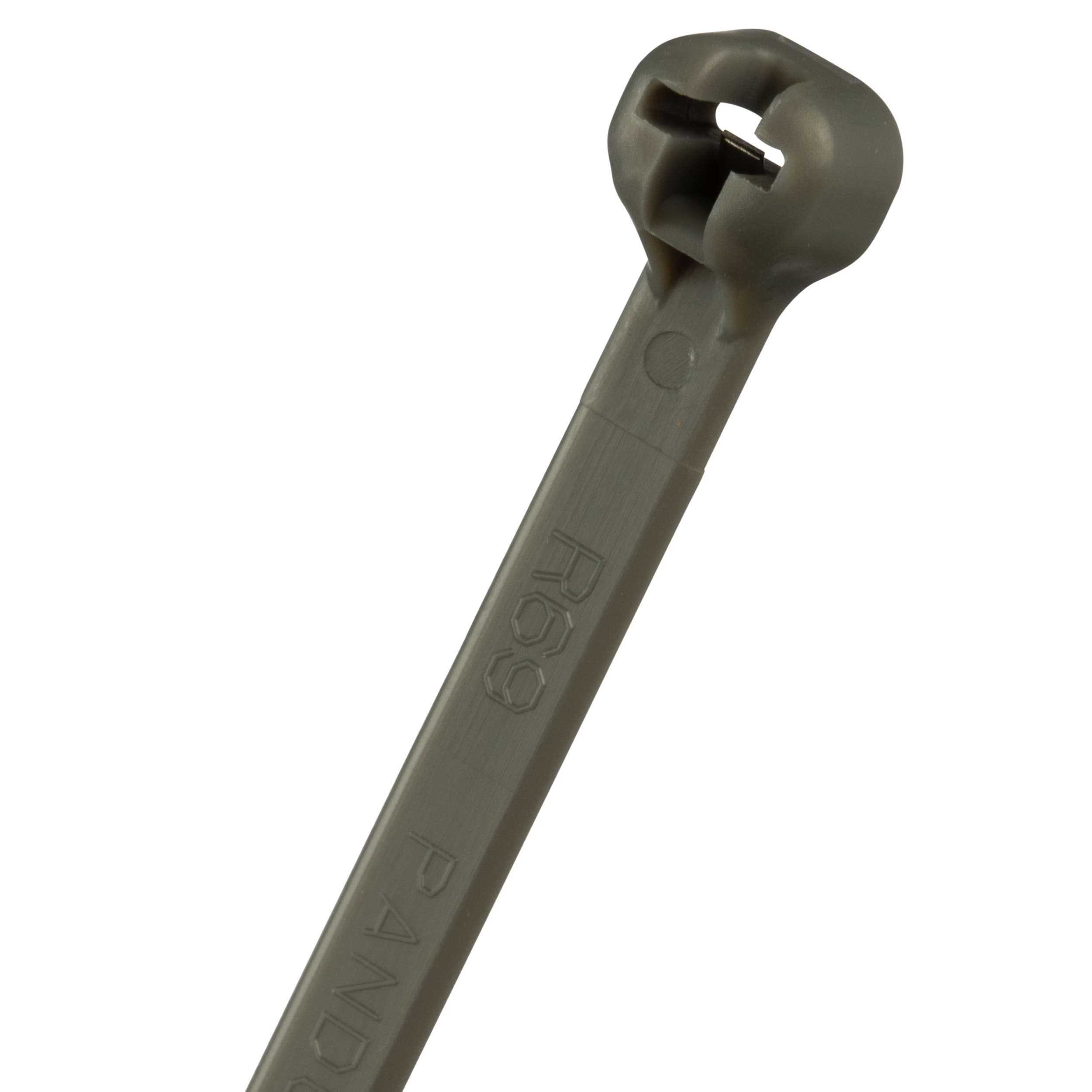 Cable Tie, Metal Barb, 8 Inches (203 mm) Length, Standard, Nylon 6.6, Gray. For indoor use. Dome-top head features unique patented design with round, smooth edges. Stainless steel locking barb provides consistent performance, reliability and infinite adjustability through entire bundle range. High strength and low thread force. Curved tip is easy to pick up from flat surfaces and allows faster initial threading.