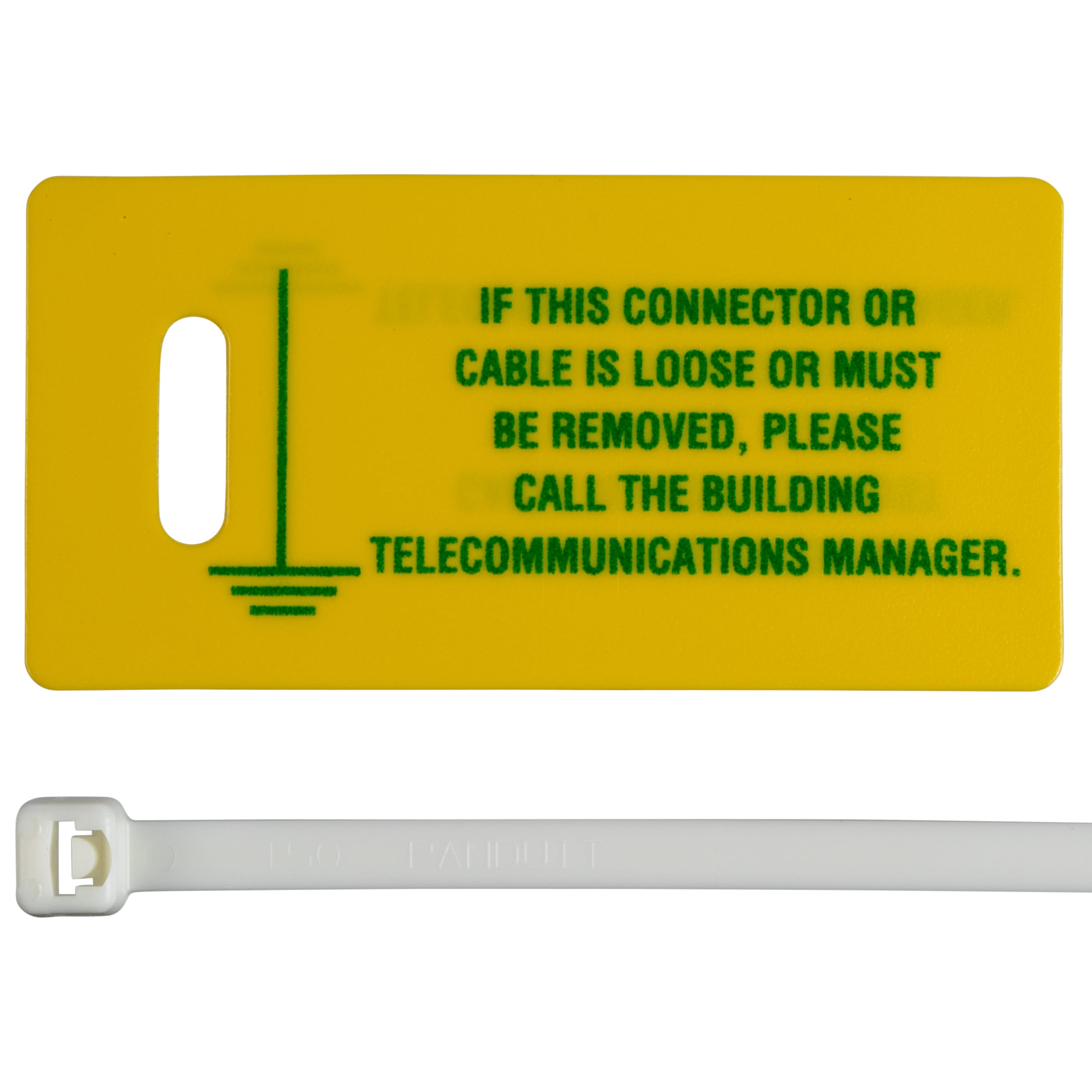 Telecomunication Grounding and Bonding Conductor Label Kit. 2.75'' x 1.38'' tag and 7.4mm (188mm) flame retardant cable tie. Text on tag states, ''IF THIS CONNECTOR OR CABLE IS LOOSE OR MUST BE REMOVED, PLEASE CALL THE BUILDING TELECOMMUNICATIONS MANAGER''. 10 tags and 10 tags per PK.