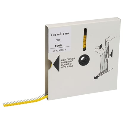 Insulated ferrules, single wire yellow DIN end sleeve on mini-reel, #24 AWG (0.25mm²) Wire Size, 0.31 (8.0 mm) Pin Length.