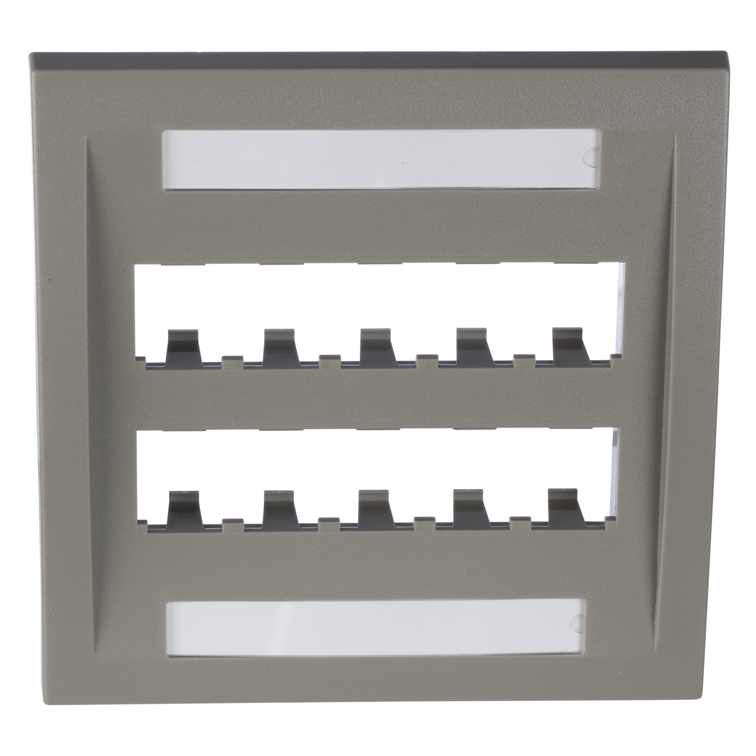 The Mini-Com® Executive Series Faceplate accepts ten Mini-Com Module. The faceplate is double gang and mounts to a NEMA standard double gang opening. The faceplate includes a raised rail design on the outer edge of the frame, has a label pocket for easy identification, and is international gray.