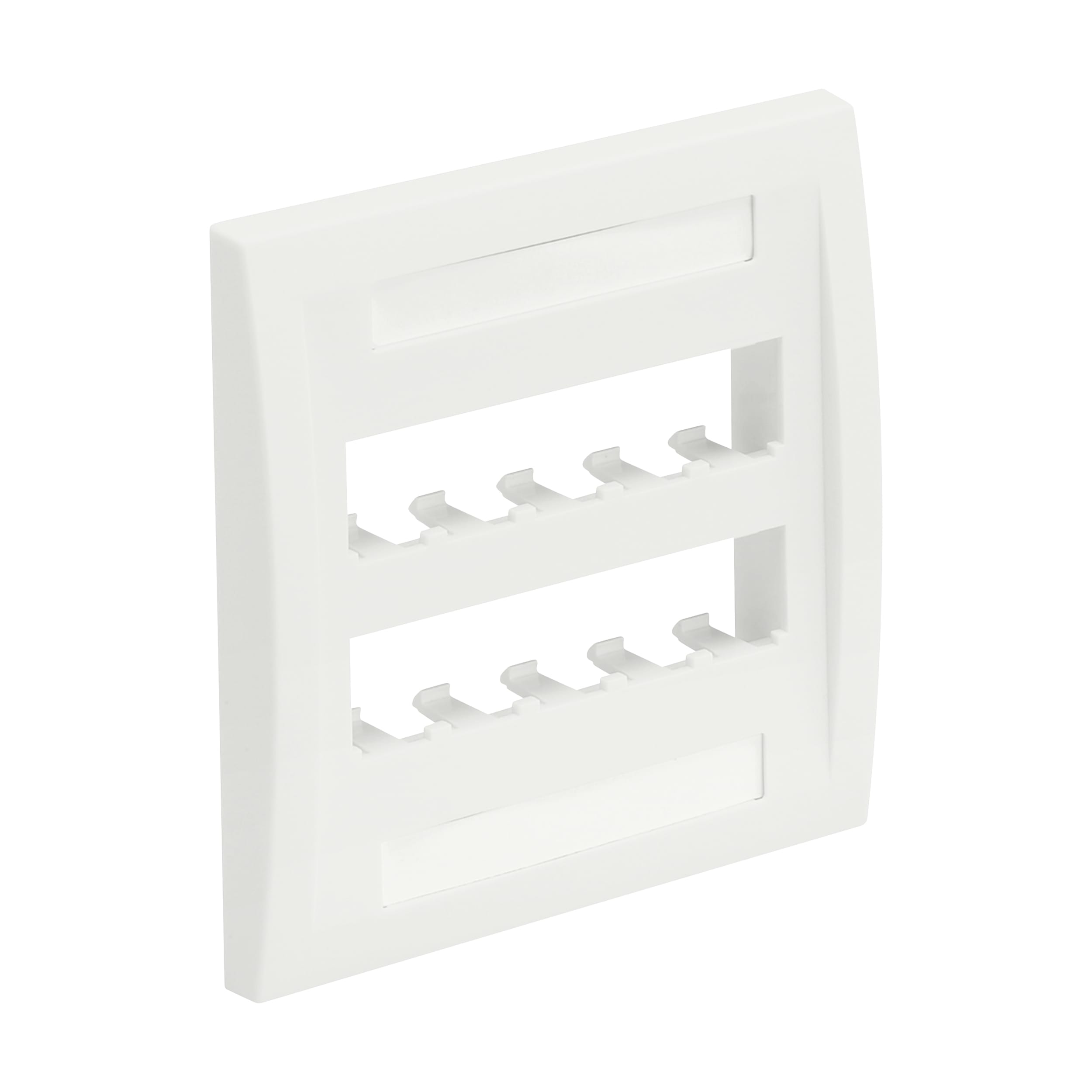 The Mini-Com® Executive Series Faceplate accepts ten Mini-Com Module. The faceplate is double gang and mounts to a NEMA standard double gang opening. The faceplate includes a raised rail design on the outer edge of the frame, has a label pocket for easy identification, and is white.