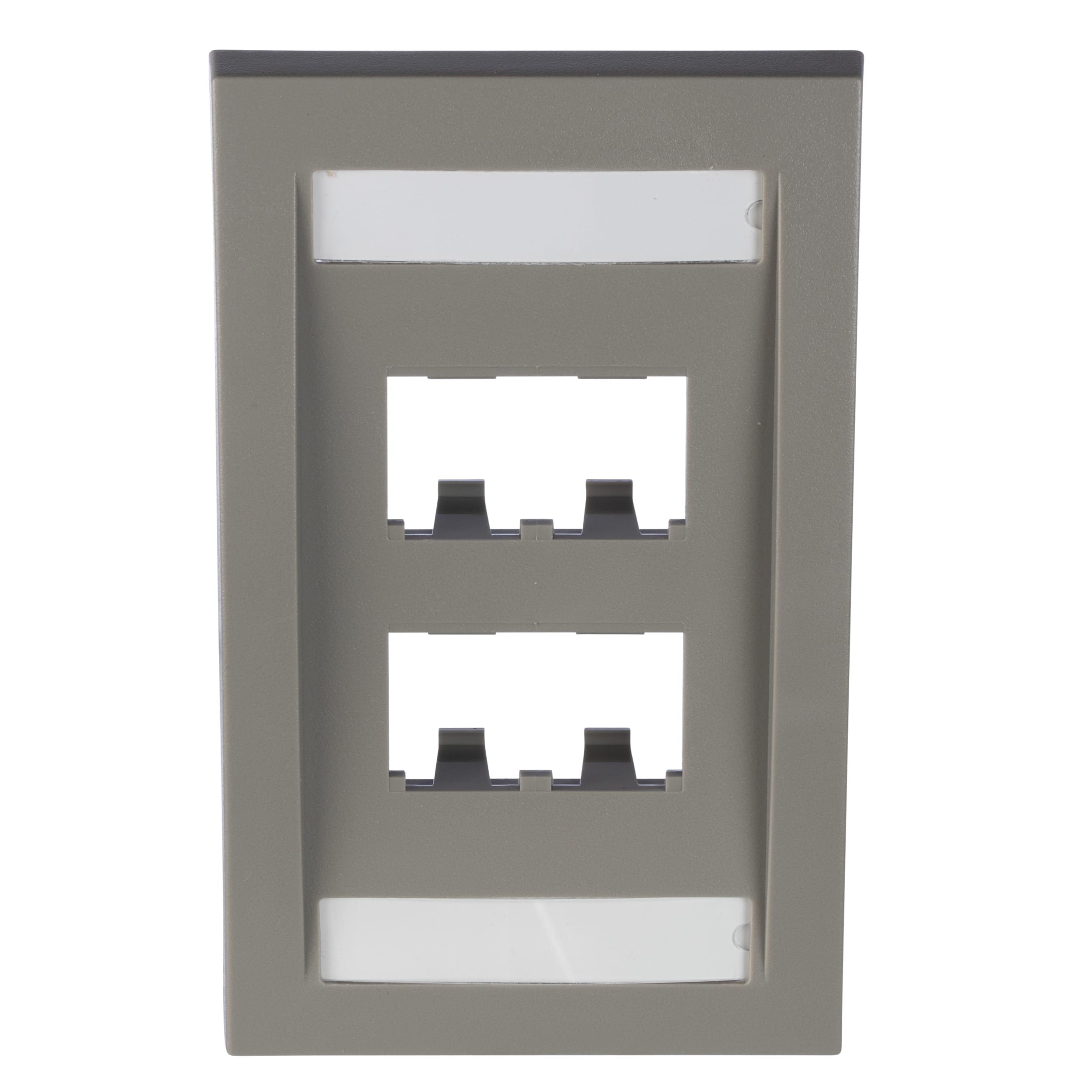The Mini-Com® Executive Series Faceplate accepts four Mini-Com Modules. The faceplate is single gang and mounts to a NEMA standard single gang opening. The faceplate includes a raised rail design on the outer edge of the frame, has a label pocket for easy identification, and is international gray.