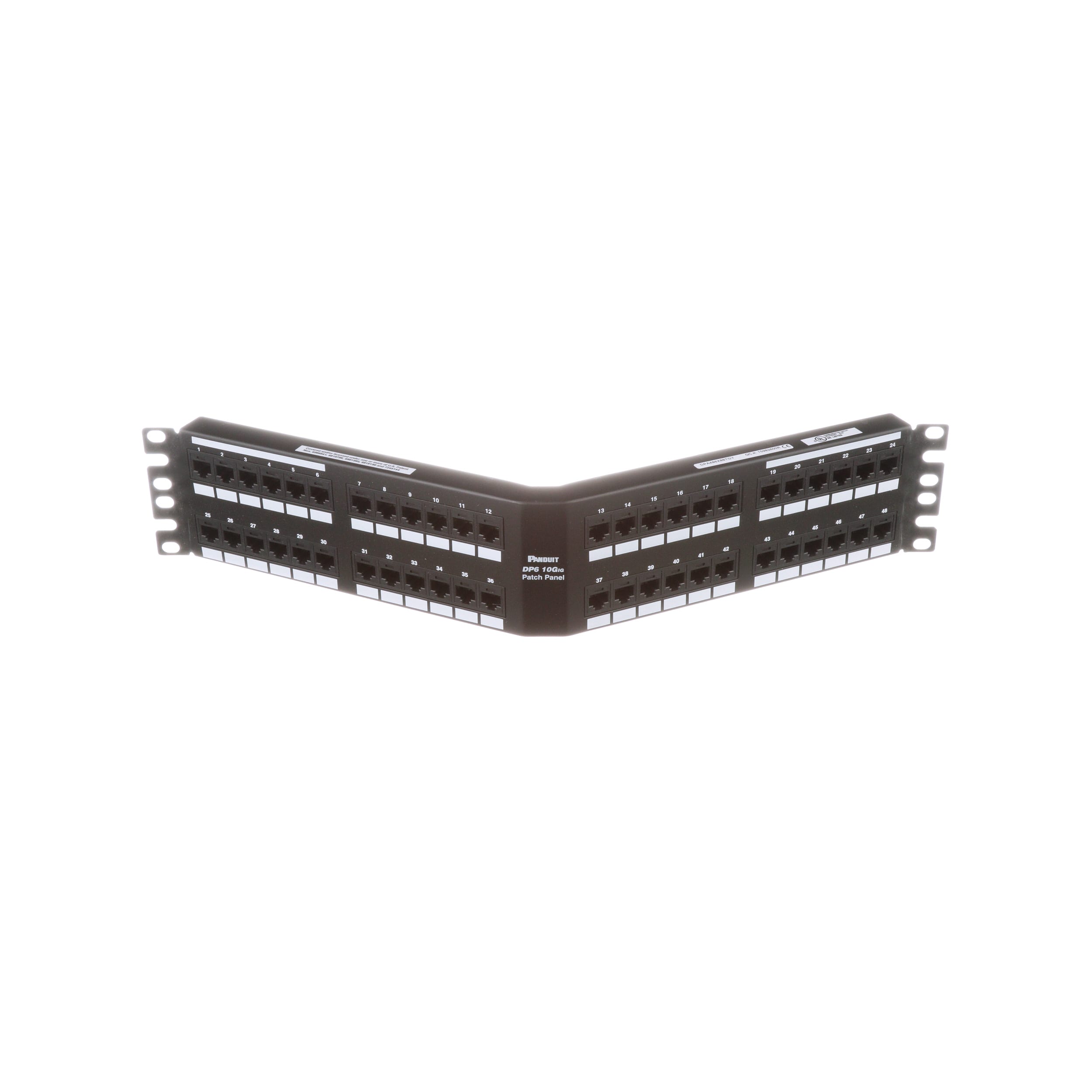 The DP6A™ PLUS Angled Cat 6A Punchdown Patch Panel terminates 4-pair, 22–26 AWG, 100 ohm unshielded twisted pair cable with an industry standard single wire 110 punchdown tool. The patch panels mount to 19 inch and 23 inch racks and include 48 ports. Each module is 100% factory tested to exceed industry standard performance requirements. The angled design facilitates proper bend radius control and minimizes the need for horizontal cable managers. The panel is 2 RU, made of steel, and is black.