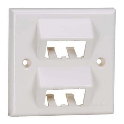 The Mini-Com® 86mm x 86mm faceplate accepts four Mini-Com Modules. The faceplate has a sloped design to improve bend radius and screw covers to conceal the mounting screws. The faceplate can be identified with an adhesive label and is off white.
