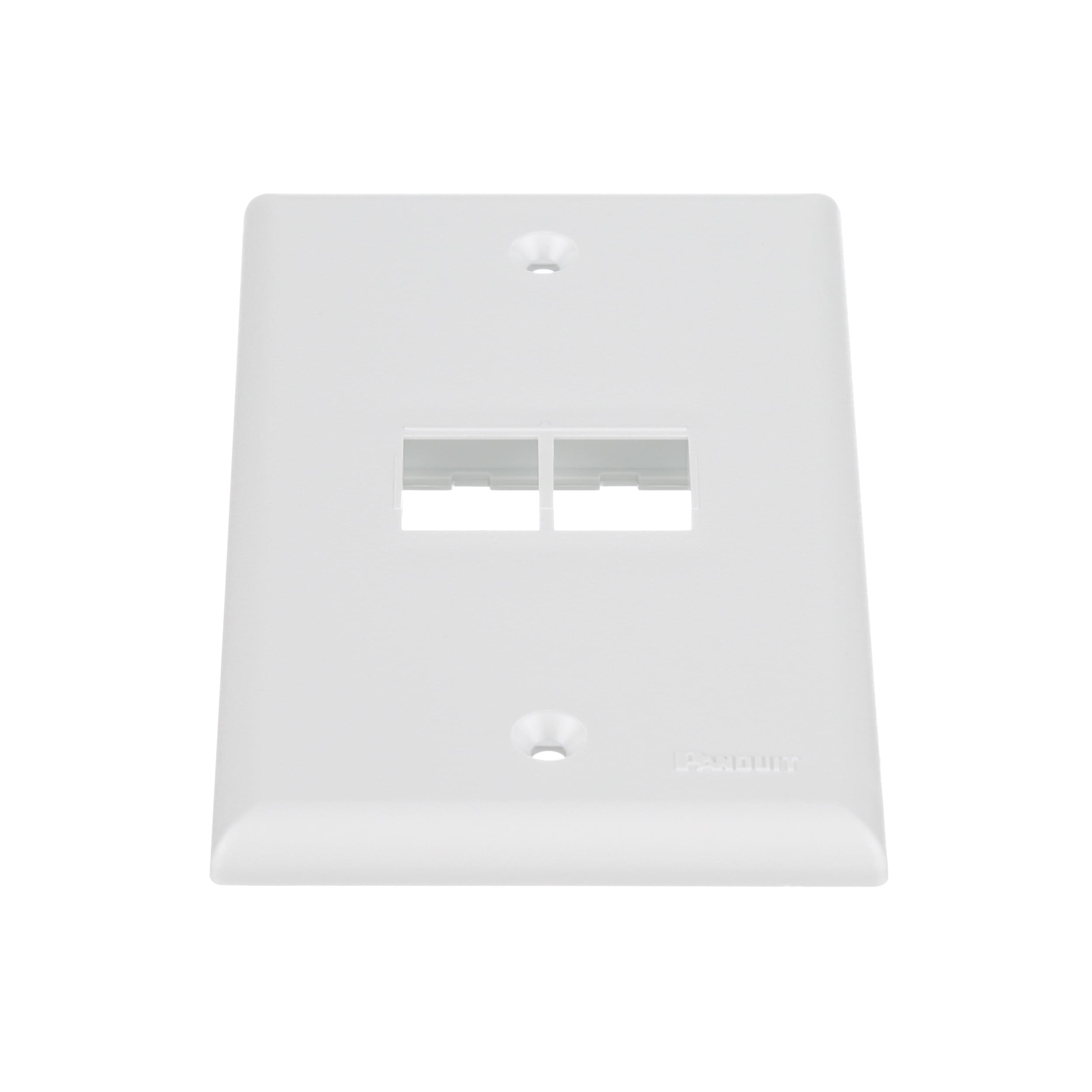 The NetKey® Faceplate accepts two keystone modules. The faceplate is single gang and mounts to a NEMA standard single gang opening. The faceplate can be identified with an adhesive label and is white.