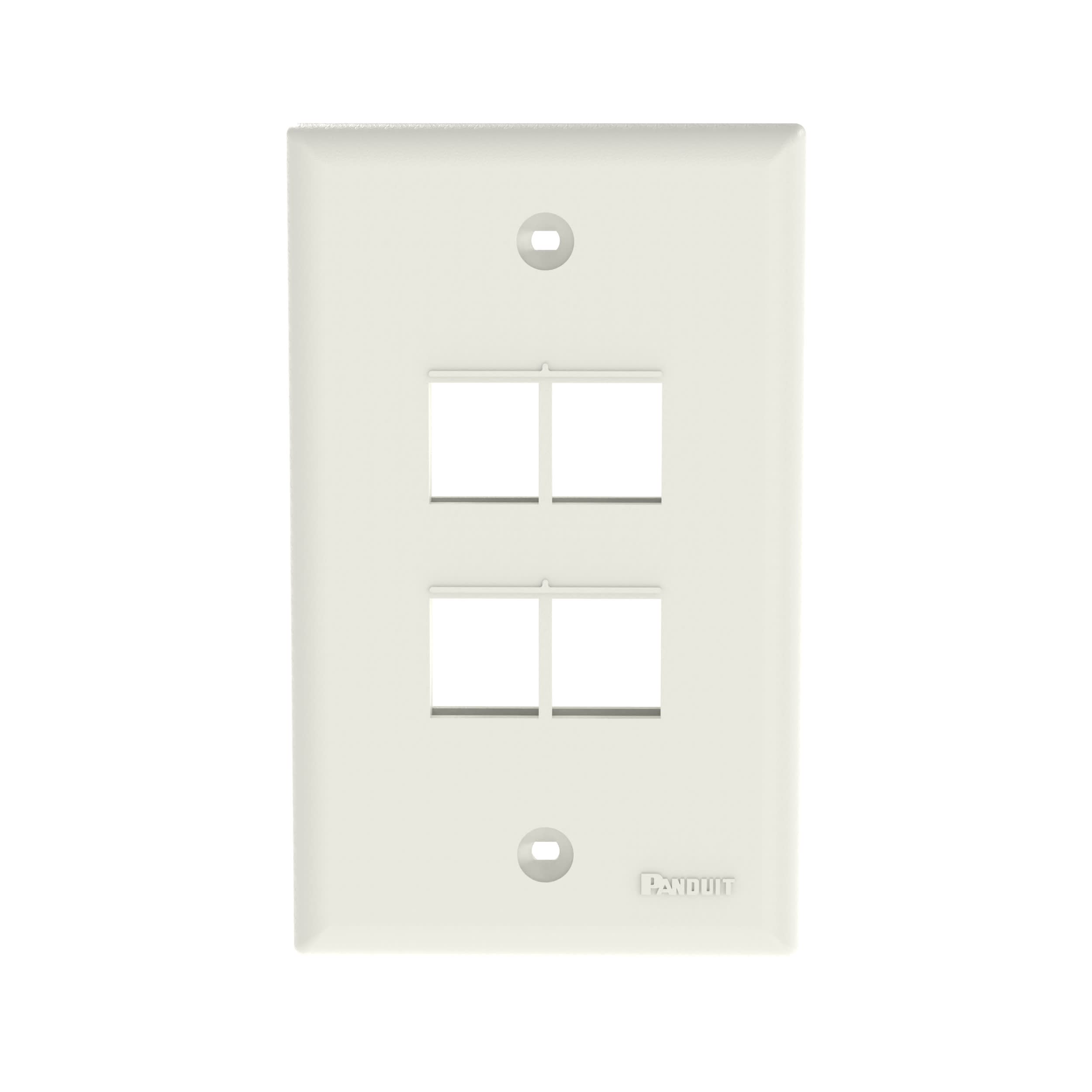 The NetKey® Faceplate accepts four keystone modules. The faceplate is single gang and mounts to a NEMA standard single gang opening. The faceplate can be identified with an adhesive label and is off white.