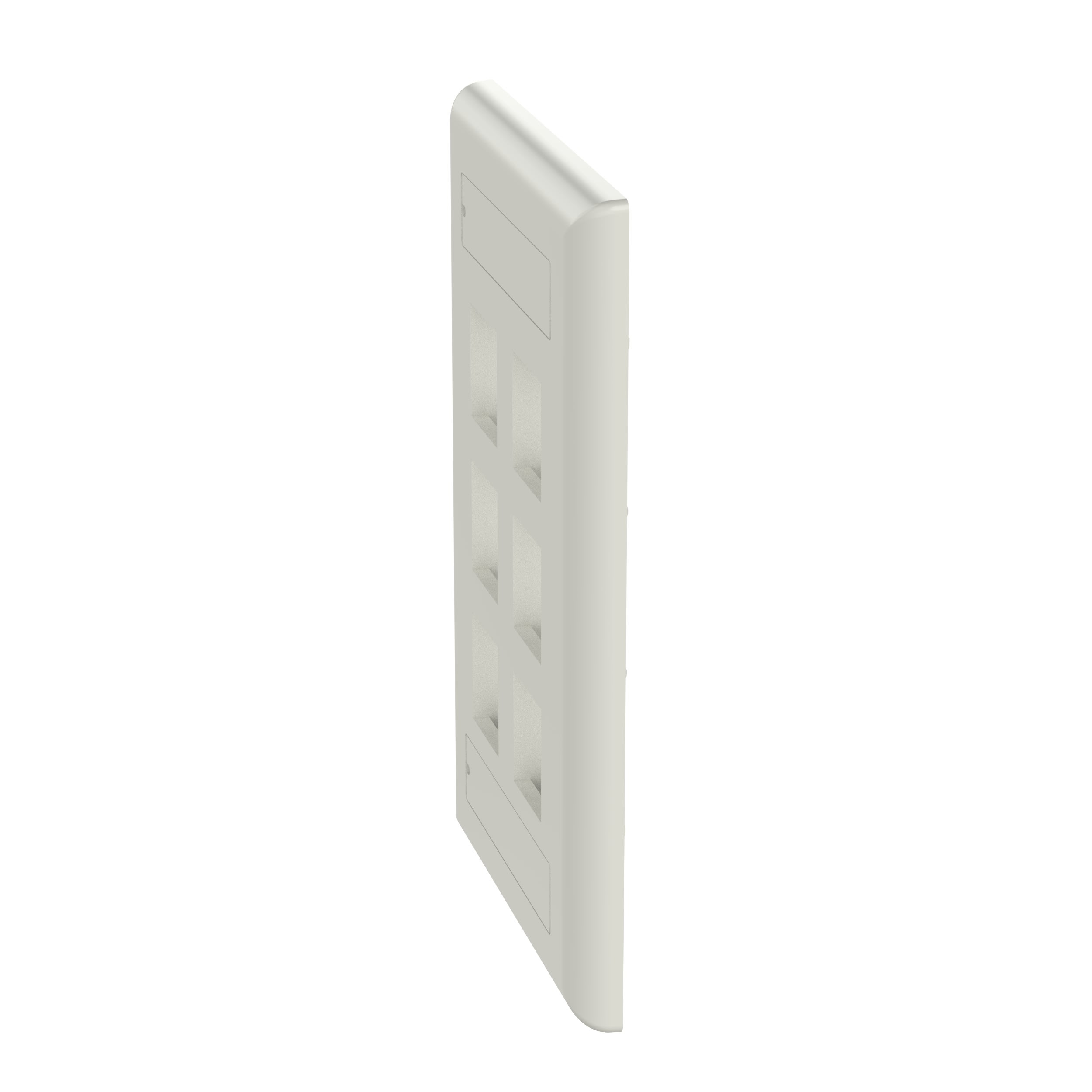 The NetKey® Faceplate accepts six keystone modules. The faceplate is single gang and mounts to a NEMA standard single gang opening. The faceplate can be identified with an adhesive label, and is international white.