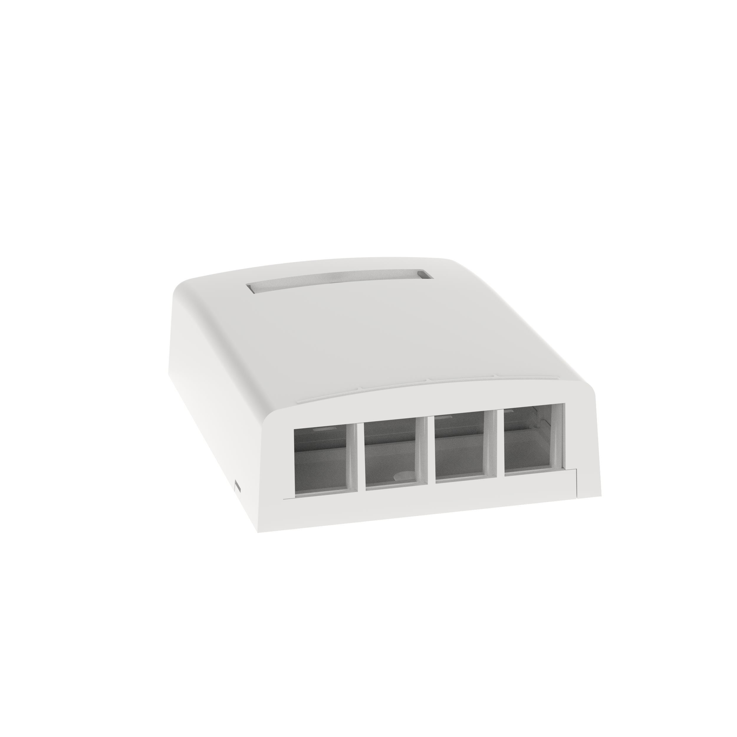 The NetKey® Surface Mount Box accepts four keystone modules. The box offers a variety of mounting options using adhesive tape, screws, or optional magnet. The box can be identified with an adhesive label and is arctic white.