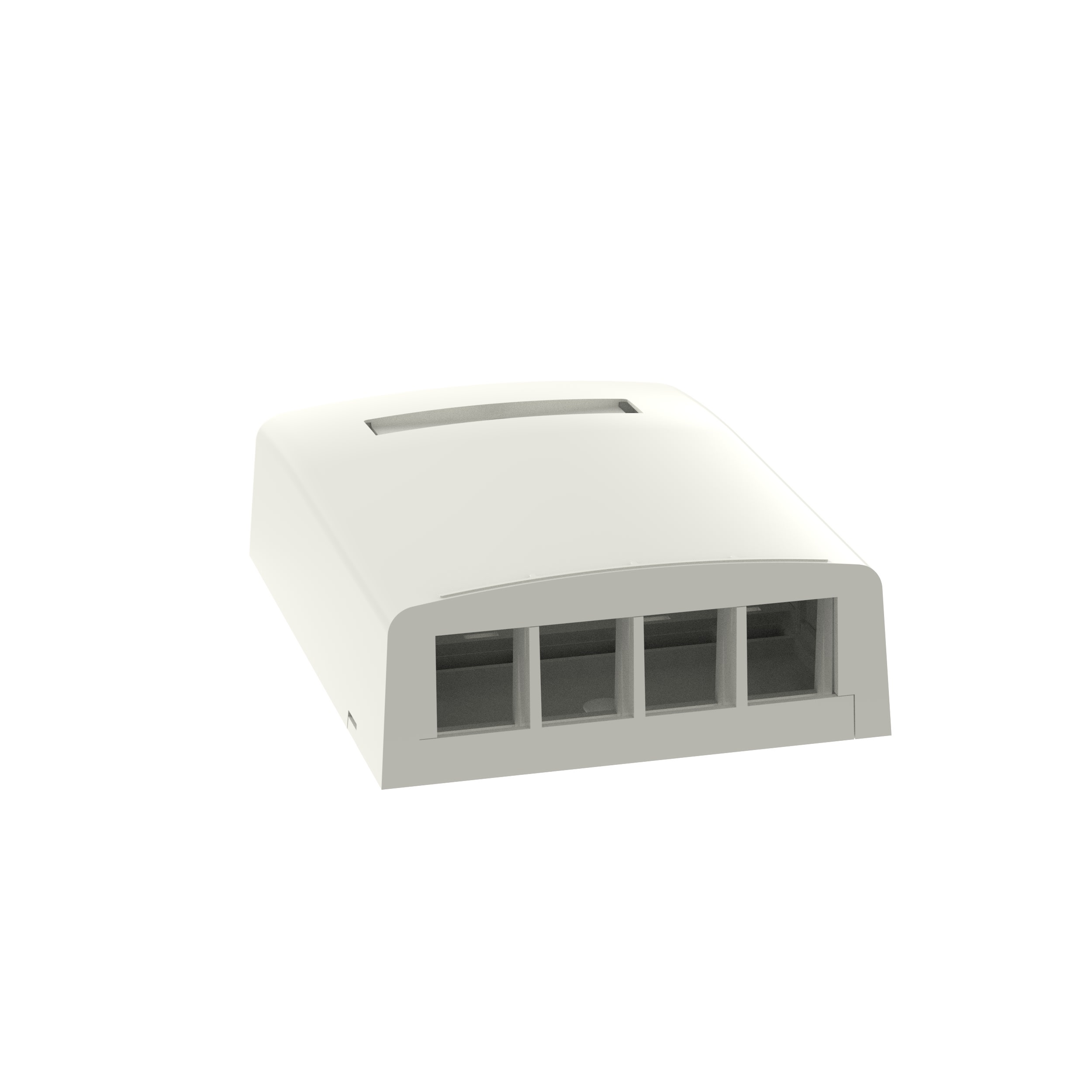 The NetKey® Surface Mount Box accepts four keystone modules. The box offers a variety of mounting options using adhesive tape, screws, or optional magnet. The box can be identified with an adhesive label and is international white.