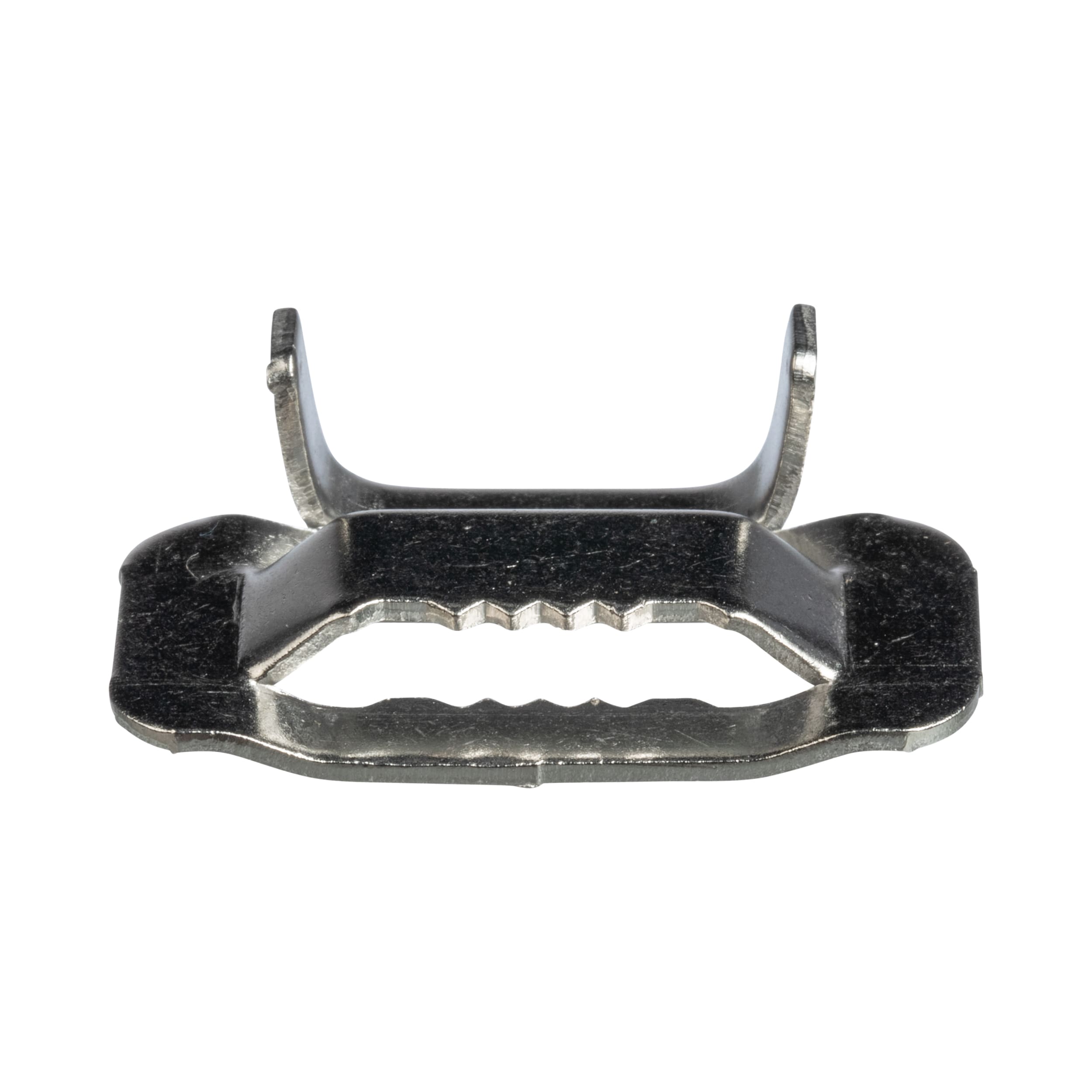 StrongHold IMSBE19-C6L E Style Buckles for metal strapping have a fold-over lock design to maintain a safe and secure connection. Made of 316 AISI stainless steel and come in packages of 100. For use with StrongHold 0.8” (19mm) strapping.