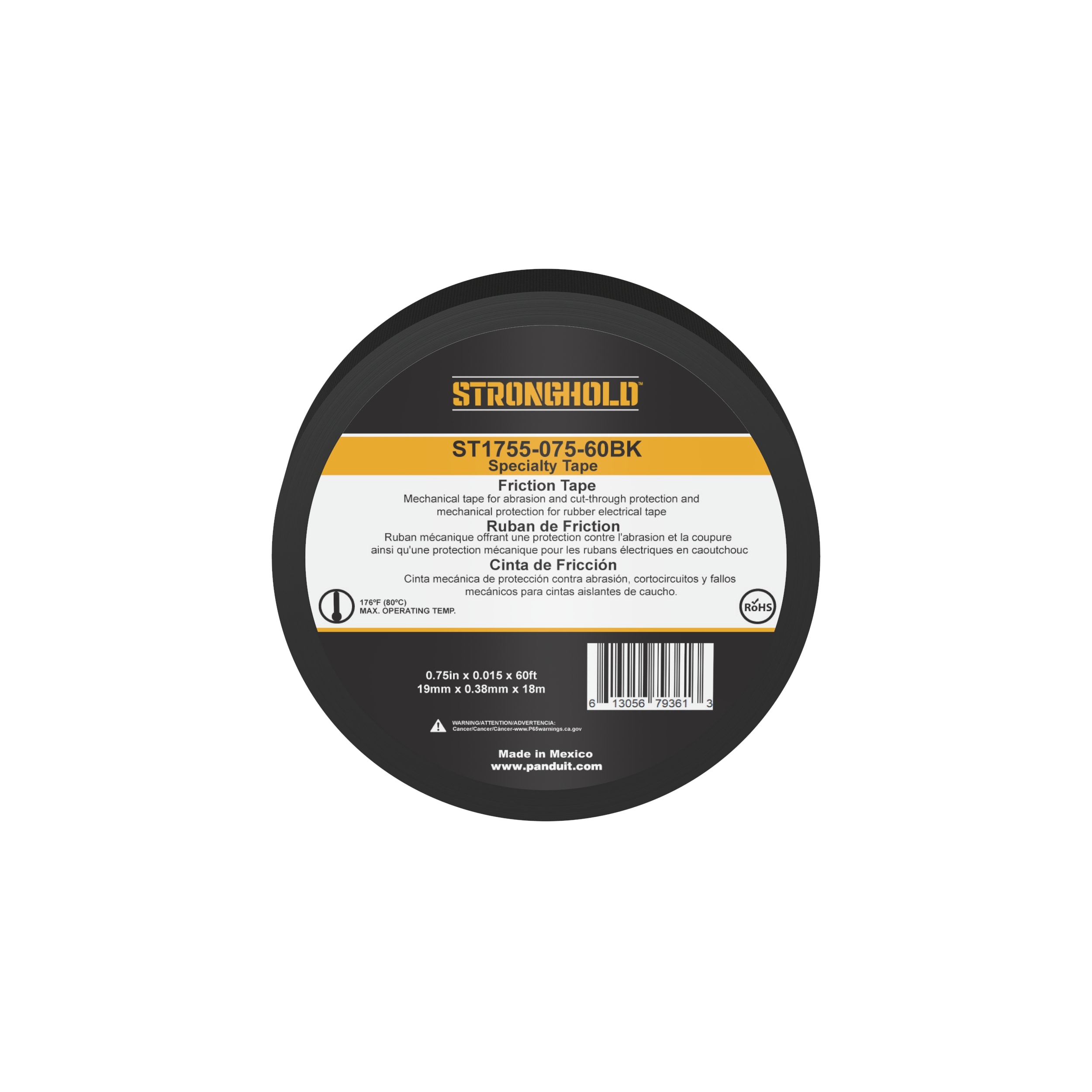 StrongHold ST1755-075-60BK Friction Tape is a mechanical tape for abrasion and cut-through protection and mechanical protection for rubber electrical tape. Both sides of the tape are coated with a high-quality cotton fabric and have a black rubber adhesive compound. Is ¾” x 60’ in size and comes in 1 roll per package, and 100 rolls per case.