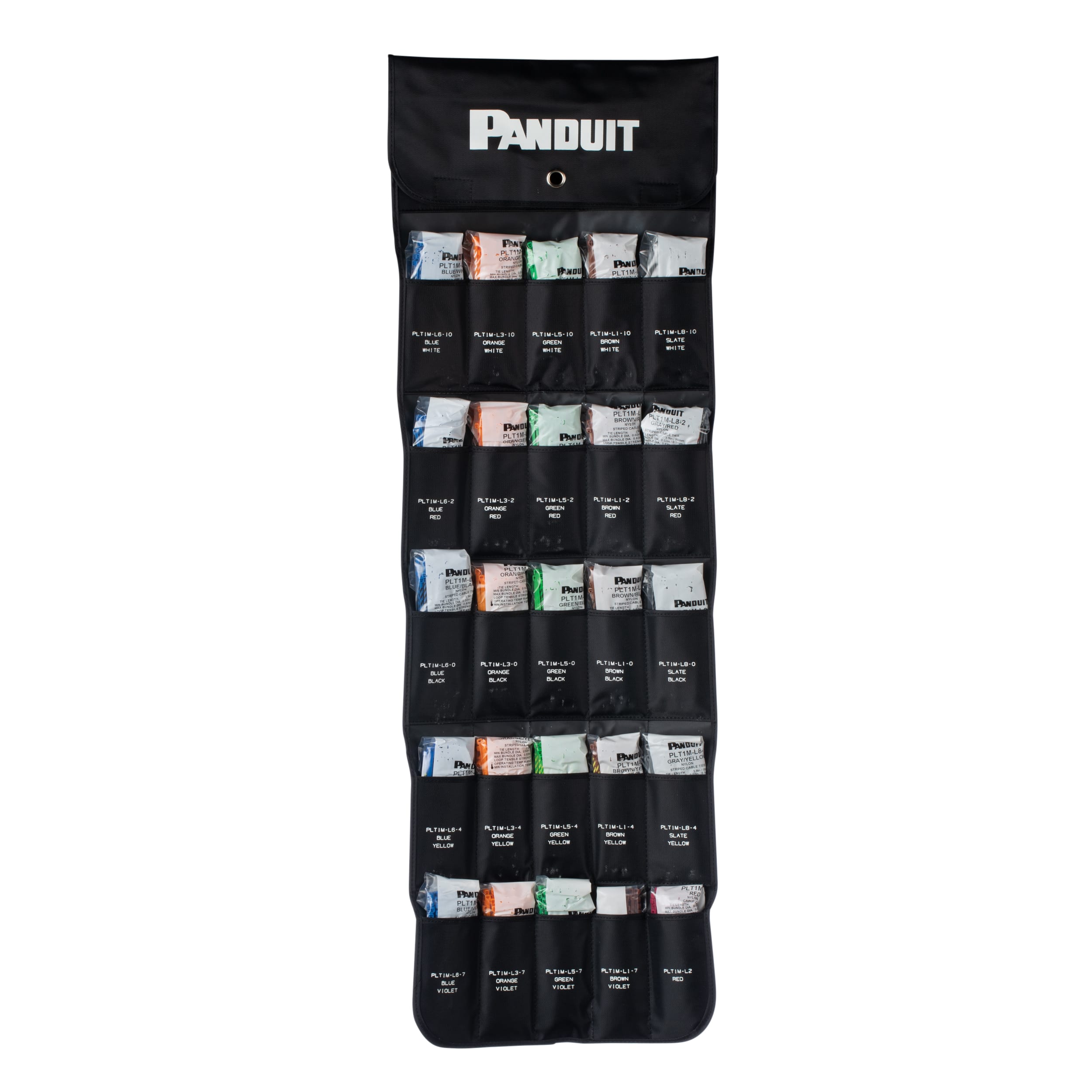 Pan-Pouch™ (2-ply Laminated Black Nylon/Vinyl) filled with 1,250 cable ties (50 each of all 24 striped ties, plus solid Red)