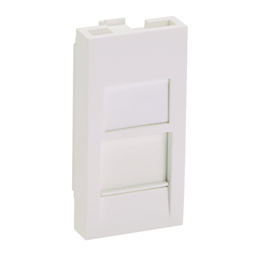 The Mini-Com® Shuttered Adapter accepts one Mini-Com Module. The adapter snaps into a standard 22.5mm x 45mm opening. The shuttered feature protects modules from dust and debris. The adapter includes a label pocket for easy identification and is arctic white.