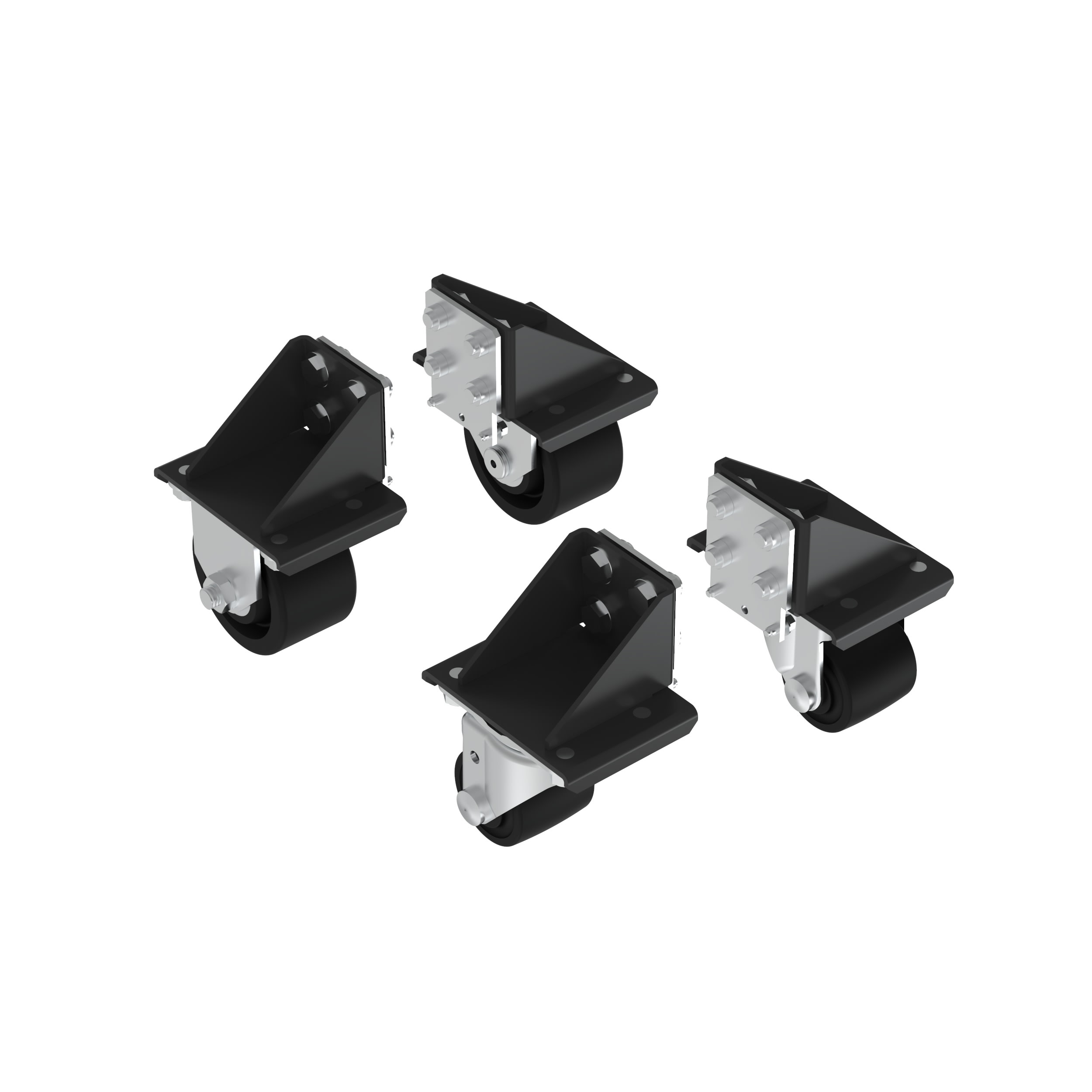 The N-Type Cabinet Caster Kit includes two fixed casters for the front of the cabinet and two swivel casters for the rear of the cabinet. These cabinet casters add 24mm to the height of the cabinet. The caster kit also includes four mounting plates and 24 screws for installation. It is black.