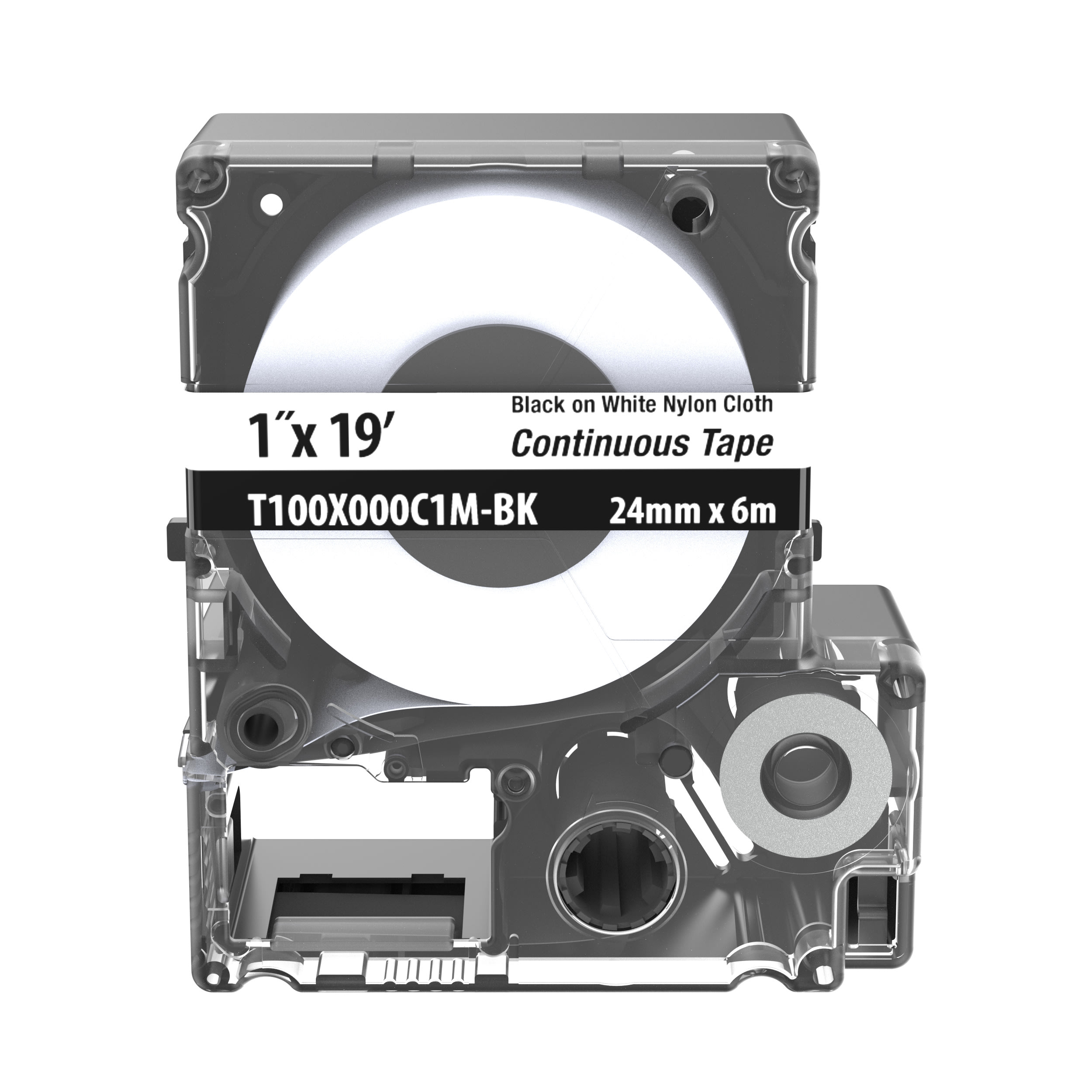 The T100X000C1M-BK Continuous Tape Cassette includes both label material and ribbon for easy changeover. For use with the MP75, MP200 and MP300 Printers. Nylon Cloth. 1'' x 19' (24 mm x 6 m). Color Black on White. 1 cassette per package.