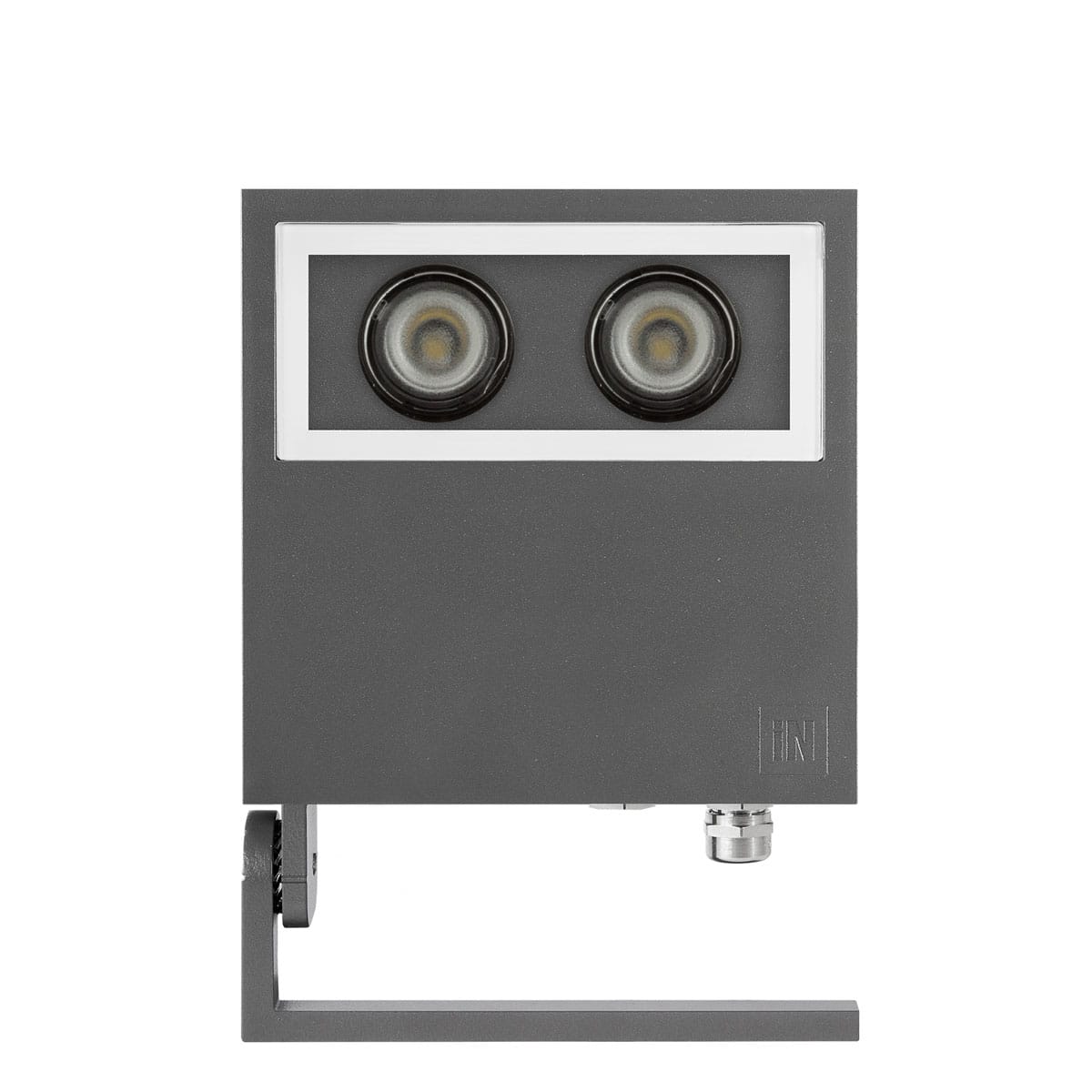 Proiettore LED per interni ed esterni, costituito da: Corpo e anello in alluminio pressofuso verniciato. Staffa di fissaggio, regolabile, in alluminio pressofuso verniciato. Diffusore in vetro piano extrachiaro temperato, serigrafato internamente. Ottica circolare. LED di alta potenza ad alto flusso luminoso di ultima generazione. Guarnizione in silicone. Viti di chiusura in acciaio inox. Pressacavo antistrappo M16x1.5 per cavi D= 5-10 mm. Disponibile picchetto in tecnopolimero per fissaggio a terra.