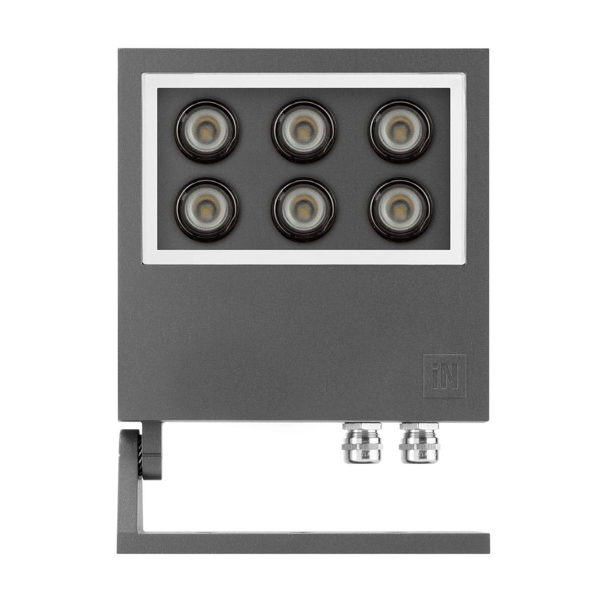 Proiettore LED per interni ed esterni, costituito da: Corpo e anello in alluminio pressofuso verniciato. Staffa di fissaggio, regolabile, in alluminio pressofuso verniciato. Diffusore in vetro piano extrachiaro temperato, serigrafato internamente. Ottica circolare. LED di alta potenza ad alto flusso luminoso di ultima generazione. Guarnizione in silicone. Viti di chiusura in acciaio inox. Pressacavo M20x1.5 per cavi D= 7- 12 mm.