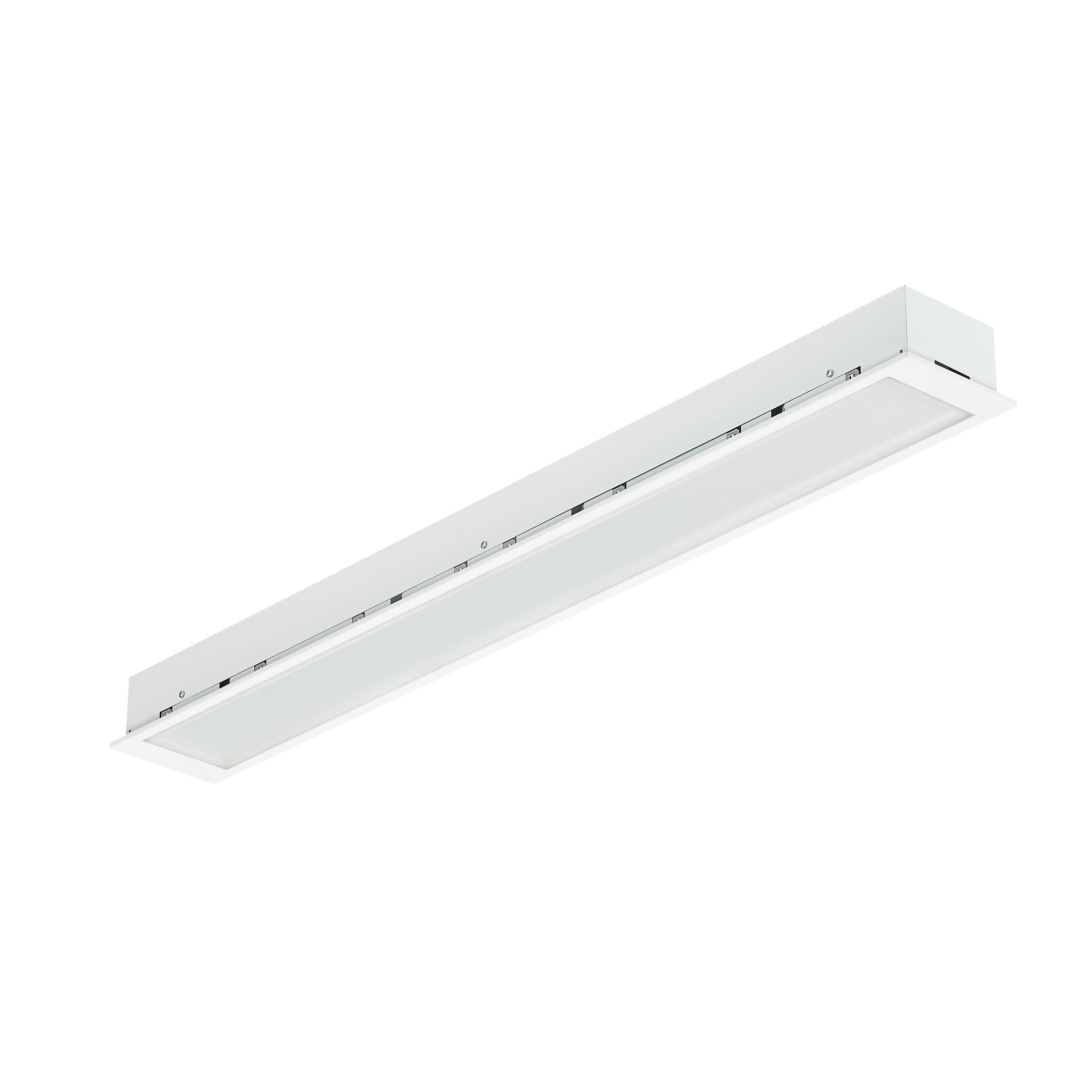 1200x150 mm, Visible profile ceiling version, Acciaio, Bianco, Bianco segnale (RAL9003), Unità di alimentazione (On/Off), 4200 lm, 48 W, 87.5 lm/W, 4000 K, (0.38, 0.37) SDCM 3, CRI90, UGR19, Fascio largo, Ottica micro-lenticolare, Policarbonato, Protetto contro l'accesso con un dito, 0,2 J standard, Classe di isolamento I, Connettore a pressione e fermacavo, Illuminazione di emergenza durata 3 ore EL3 versione Pro