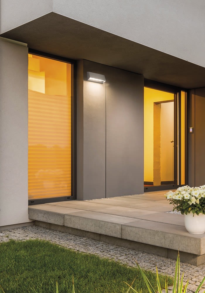 Apparecchio LED a parete per esterno (IP54), con alimentatore LED integrato, fascio di luce direzion ato verso il basso. Struttura in pressofusione dialluminio verniciato con polveri poliestere a elevata resistenza ai raggi ultravioletti e alla corro sione, diffusore in policarbonato. Disponibile in finitura grigia e due temperature colore (3000K e4000K). Disponibili giunti certificati IP68 per la realizzazione delle connessioni elettriche, sicure, durevoli e con barriera anticondensa (pag.718).