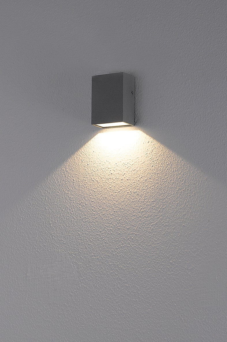 Apparecchio LED a parete per esterno (IP54). Struttura in pressofusione di alluminio verniciato con polveri poliestere a elevata resistenza ai raggi ultravioletti e alla corrosione, diffusore in vetro temperato. Alimentatore LED integrato. Disponibile nella versione piatta monoemissione con installazione a parete sul lato lungo, nella versione verticale biemissione con installazione a parete sul lato corto. Disponibile in due finiture e due temperature colore (3000K e 4000K). Disponibili giunti certificati IP68 per la realizzazione delle connessioni elettriche, sicure, durevoli e con barriera anticondensa.