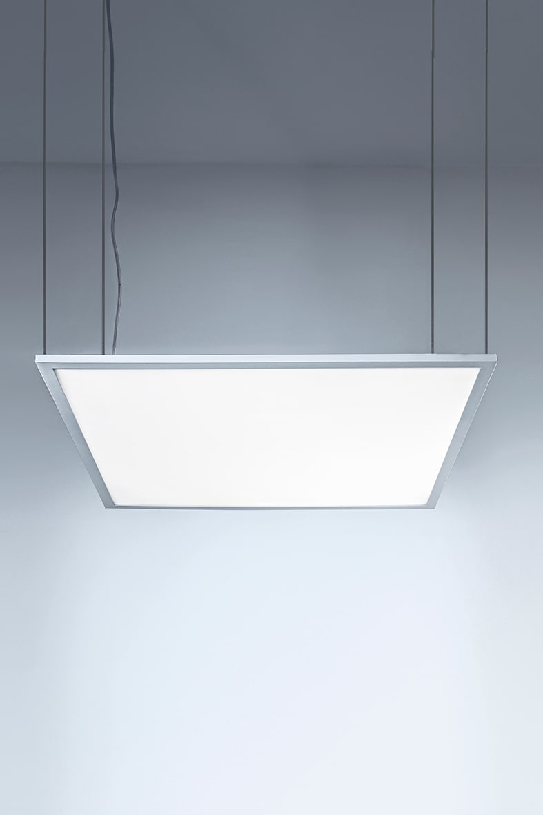 Panel LED quadrato (600x600mm) o rettangolare (300x1200mm) con cornice in alluminio verniciato bianco e diffusore in polistirene con schermo microprismato (per la versione UGR<19). Cornice in plastica per la versione STANDARD. Apparecchio ad alta efficenza luminosa, flicker free. Proposto in due gradazioni colore (3000K e 4000K), con UGR<19 (per installazione in ambienti con videoterminali), nella versione con CRI>90 (per uffici pubblici e per il settore retail) e nella versione on/off, 0-10V push dimm e DALI con alimentatore LED incluso da installare in remoto. Installabile ad incasso in controsoffitti a pannelli (modulare 600x600mm) con struttura a vista e, con gli appositi accessori da ordinare separatamente, a sospensione, a plafone, ad incasso in cartongesso (in battuta o in appoggio) (tranne versione STANDARD). Disponibile kit di emergenza (3 ore) da ordinare come accessorio.