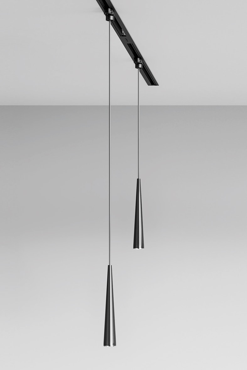 Sospensione a 1, 3 o 5 luci con struttura a forma di cono realizzata in metallo laccato in tre finiture (bianco, nero e oro satinato). Particolari e cavo elettrico, rivestito in tessuto, in tinta con il corpo lampada. Proposta nella versione singola, con kit decentramento a tre o cinque elementi, oppure con rosone lineare da tre elementi. Soluzione disponibile anche per binario SQUASH, SQUASH PRO e GROOVE EVO. Portalampada GU10 che consente di montare lampadina LED.