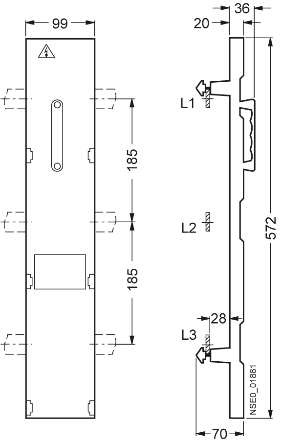 accessori per sezionatori verticale sottocarico con fusibili 3NJ41 copertura di sezione libera per sbarre collettrici con interasse sbarre collettrici 185 mm, larghezza 100 mm Gamma completa di accessori per una flessibilità aumentata. Da ponticelli di collegamento attraverso blocchetti di contatti ausiliari fino a vari tipi di comandi, quarto polo o coperture per contatti: molteplici accessori consentono in qualsiasi momento e per esigenze diverse l'impiego e il retrofit dei sezionatori sottocarico e dei commutatori di rete. I sezionatori sottocarico a fusibili Siemens 3NJ4 si contraddistinguono soprattutto per le seguenti caratteristiche: 1. Conformità alle norme IEC/EN 60439-1 e IEC/EN 60947-3. 2. Livelli di tensione fino ad AC 690 V. 3. Posizione di parcheggio per lavori di manutenzione. 4. Posizione di installazione verticale e orizzontale. 5. Resistenza agli agenti atmosferici. 6. Grado di protezione IP30 con inserti portafusibili con maniglia chiusi, altrimenti IP10.