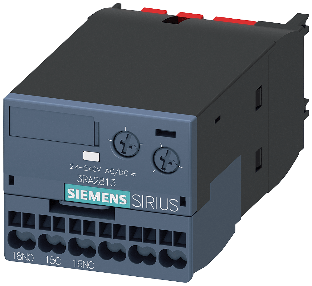blocchetto di contatti ausiliari ritardato elettronicamente blocchetto di contatti ausiliari, ritardato all'eccitazione, relè: 1 CO, intervallo di tempo 0,05...100 s, AC/DC 24...240 V, 50/60 Hz, varistore per lo smorzamento delle bobine del contattore integrato, morsetti a molla, innestabile a scatto sul lato frontale per contattori 3RT20 e contattori ausiliari 3RH2 Blocchetto di contatti ausiliari ritardato elettronicamente SIRIUS 3RA28 per la commutazione ritardata di circuiti a valle per il montaggio su contattori 3RT2 e contattori ausiliari 3RH2. I blocchetti di contatti ausiliari ritardati elettronicamente offrono un'elevata precisione di regolazione con campi dei tempi commutabili e dispongono di un interblocco elettrico integrato e di un varistore integrato lato fabbrica (circuitazione di protezione). L'inserimento semplice e senza attrezzi consente la realizzazione di funzioni di temporizzazione indipendenti dall'apparecchiatura di comando senza cablaggio addizionale. Si escludono così gli errori di cablaggio e si riducono i costi di collaudo. Grazie al montaggio frontale agli apparecchi si risparmia posto sulla guida DIN. Gli apparecchi sono impiegabili in tutto il mondo grazie ad approvazioni internazionali (ad es. IEC, CCC, UL/CSA). I blocchetti di contatti ausiliari ritardati elettronicamente sono fornibili per contattori 3RT2 e contattori ausiliari 3RH2 nelle grandezze costruttive da S00 a S3. Disponibili con un ampio campo di tensione AC/DC 24-240 V, uscite a scelta 1 NO + 1 NC o 1 CO e con morsetti a vite o a molla. Per i blocchetti di contatti ausiliari ritardati elettronicamente sono disponibili kit di cablaggio e una copertura piombabile. Relè SIRIUS - un programma per ogni evenienza.