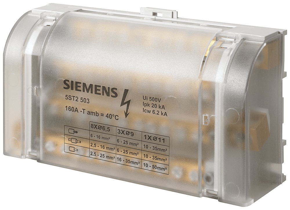 SIEMENS - Blocco distributore a 4 poli, 160A, 500V ingresso 1x 10-35mm² uscita 3x 6-25+8x 2,5-16mm²