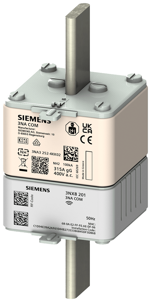 cartuccia fusibile NH 3NA COM con funzione di misura grandezza costruttiva 2 In 200A Un 400 V classe di impiego gG con modulo di elettronica attacchi sotto tensione e segnalatore di intervento frontale Osservare le omologazioni nazionali! Lista dei paesi: vedi certificati Cartuccia fusibile NH SENTRON 3NA3 per la protezione selettiva dei cavi e dell'impianto. Il sistema di fusibili NH offre una protezione efficace per le persone, gli apparecchi e gli impianti grazie alla disinserzione sicura in caso di sovraccarico e cortocircuito. I fusibili 3NA COM consentono un elevato livello di trasparenza di rete grazie alla misura di corrente e alla comunicazione wireless e sono quindi particolarmente indicati per la digitalizzazione delle reti elettriche. La forma costruttiva normalizzata consente un retrofit semplice ed economico nei sistemi esistenti. Le cartucce fusibili NH sono disponibili da 2 A a 1250 A e nelle grandezze costruttive 000, 00, 0, 1, 2, 3, 4 e 4a. Le varianti con funzione di comunicazione e di misura nella grandezza costruttiva 2 da 80 A fino a 315 A. Dispositivi di protezione SENTRON - Una scelta sicura. Ora ancora più intelligenti.