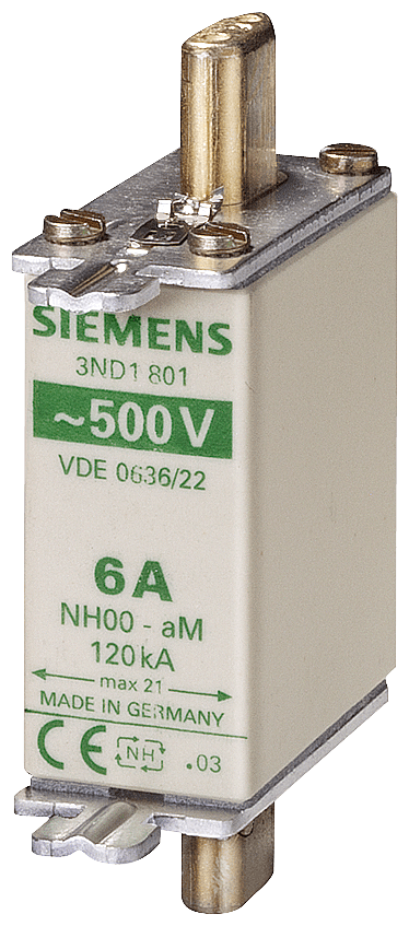 cartuccia fusibile NH, NH000, In: 100 A, aM, Un AC: 500 V, segnalatore di intervento frontale, attacchi sotto tensione Cartuccia fusibile NH SENTRON 3ND per la protezione di apparecchi di manovra in circuiti di comando motore. I fusibili 3ND forniscono una protezione efficace in caso di cortocircuito e sono particolarmente adatti per il funzionamento nei circuiti motore grazie alle loro caratteristiche di disinserzione ritardata. Le cartucce fusibili 3ND sono disponibili da 6 A a 630 A e nelle grandezze costruttive 000, 00, 0, 1, 2 e 3. Dispositivi di protezione SENTRON - Una scelta sicura. Ora ancora più intelligenti.