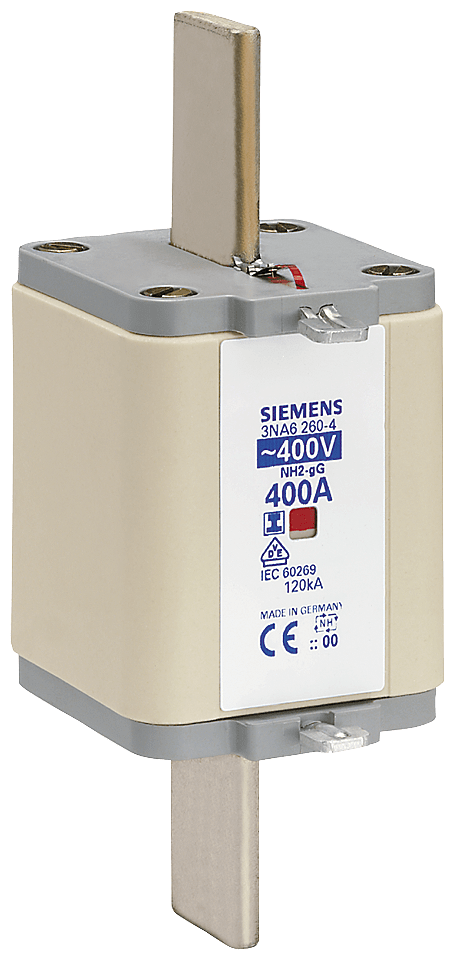 cartuccia fusibile NH, NH2, In: 400 A, gG, Un AC: 400 V, indicatore combinato, isolato attacchi Cartuccia fusibile NH SENTRON 3NA6 per la protezione selettiva dei cavi e dell'impianto. Il sistema di fusibili NH offre una protezione efficace per le persone, gli apparecchi e gli impianti grazie alla disinserzione sicura in caso di sovraccarico e cortocircuito. Segnalazioni combinate rivelano l'intervento del fusibile mediante un chiaro cambio di colore da rosso a bianco. Le cartucce fusibili NH sono disponibili da 2 A a 1250 A e nelle grandezze costruttive 000, 00, 0, 1, 2, 3, 4 e 4a. Le varianti con funzione di comunicazione e di misura nella grandezza costruttiva 2 da 80 A fino a 315 A. Dispositivi di protezione SENTRON - Una scelta sicura. Ora ancora più intelligenti.