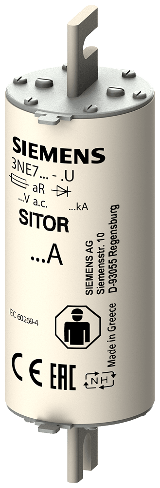 Cartuccia fusibile SITOR, con contatti a coltello intagliati, NH3, In: 350 A, aR, Un AC: 2000 V, Un DC: 440 V, segnalatore di intervento frontale I fusibili di protezione per semiconduttori SITOR 3NE, 3NC proteggono i semiconduttori dagli effetti di un cortocircuito. Il sistema di fusibili SITOR di Siemens, quale parte integrante importante dei componenti di protezione SENTRON per l'installazione elettrica, offre una protezione efficace per le persone, gli apparecchi e gli impianti grazie alla disinserzione sicura in caso di sovraccarico e cortocircuito. Il campo d'impiego comprende inoltre convertitori di frequenza con fusibili nel circuito d'ingresso e nel circuito intermedio DC nonché impianti di alimentazione di continuità UPS e softstarter per motori. I fusibili SITOR di Siemens si contraddistinguono soprattutto per le seguenti caratteristiche: 1. Caratteristica di disinserzione extrarapida rispetto ai comuni fusibili NH. 2. Protezione sicura anche dei semiconduttori di potenza in caso di cortocircuito. 3. Lo standard di qualità Siemens assicura una corrispondenza ottimale alla curva caratteristica. 4. I fusibili cilindrici SITOR sono omologati secondo IEC e UL nonché in gran parte anche secondo CCC e possono pertanto essere impiegati in tutto il mondo. 5. Adatti in parte per il montaggio su basi portafusibili NH, in sezionatori sottocarico a fusibili NH e sezionatori sottocarico con fusibili.