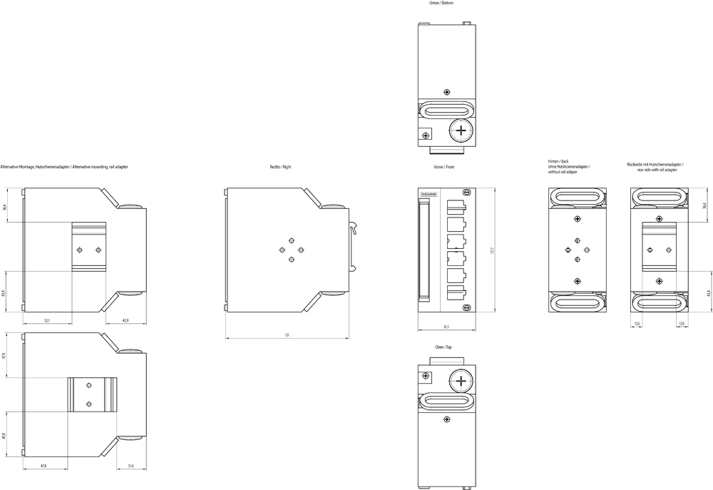 Cu/FO Modular Outlet portamoduli per il montaggio di Keystone IE RJ45 oppure coupler FO LC; montaggio su guida DIN; 1 confezione = 1 pezzo. Cu/FO Modular Outlet come supporto portamoduli per il montaggio di fino a 6 IE RJ45 Keystone (6GK19010BE100AA0) e/o FO LC Coupler (6GK19010RP100AA0) su guida DIN