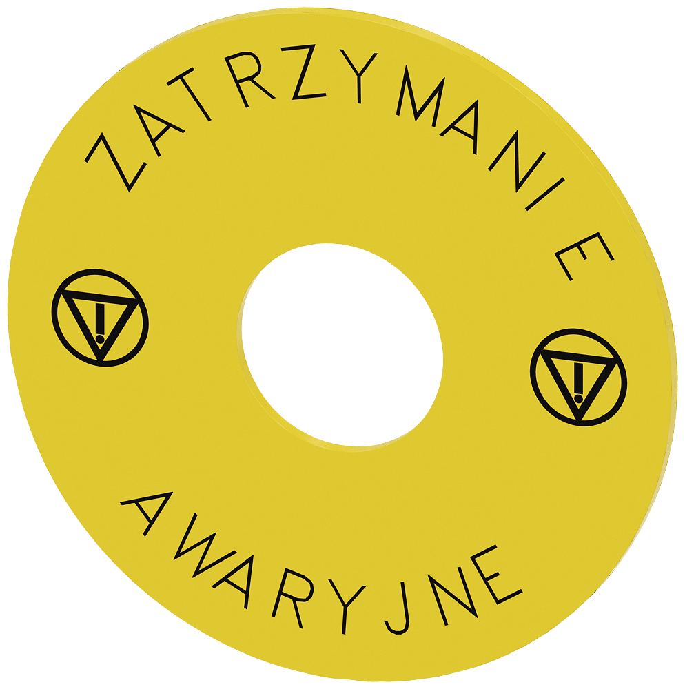 disco targhetta per ARRESTO DI EMERGENZA, giallo, con iscrizione (polacco): Zatrzymanie, simbolo 5638, Awaryjne, simbolo 5638, diametro esterno 75 mm, diametro interno 22,5 mm, spessore 2 mm Disco targhetta per ARRESTO DI EMERGENZA per la siglatura dei dispositivi di comando e segnalazione SIRIUS ACT. Siemens offre, sotto il nome commerciale SIRIUS ACT, un portfolio esclusivo di dispositivi di comando e segnalazione con omologazioni di prodotto per il mercato mondiale in tre moderne serie di design in robusto metallo puro e plastica pregiata.L'innovativo concetto di innesto a scatto semplifica talmente il montaggio che per eseguirlo basta una sola mano e non servono attrezzi speciali. Per i fori di montaggio sono sufficienti semplici fori non scanalati, essendo già integrata una protezione antirotazione al 100 %.Grazie al grado di protezione elevato i robusti apparecchi sono adatti all'impiego industriale e in ambiente esterno. È persino possibile la pulizia con getto ad alta pressione. Né polvere, né oli, né liscivia possono comprometterne il funzionamento affidabile.Oltre che con il cablaggio standard, gli apparecchi possono essere collegati al controllore anche tramite PROFINET, AS-Interface oppure IO-Link. Potete così ridurre il vostro onere di cablaggio, minimizzare le fonti di errore e ottenere maggiore flessibilità.Il configuratore online grafico supporta in modo confortevole la scelta e l'ordinazione di singoli apparecchi, pulsantiere e iscrizioni. È disponibile una documentazione completa (ad es. manuale, dati 3D, schema di collegamento). Ampia gamma di accessori opzionali (ad es. targhette identificative, per protezione e accesso, operatori, accessori per pulsantiere). SIRIUS ACT- Performance in Action nel comando e nella segnalazione. Semplici da montare, altamente performanti, semplicemente perfetti.