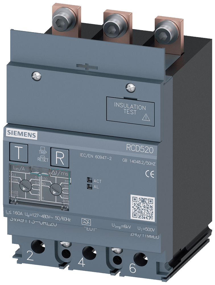 dispositivo di protezione differenziale RCD520 Basic RCD Tipo A montato in basso corrente di guasto nominale 0,03 ... 5 A a 50/60 Hz tempo regolabile 0 ... 3000 ms a 3 poli In=160A Ue=100-480V Accessori per: 3VA1 Interruttori automatici scatolati SENTRON 3VA - un sistema. Per tutte le applicazioni.