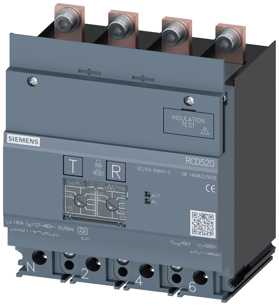 dispositivo di protezione differenziale RCD520 Basic RCD Tipo A montato in basso corrente di guasto nominale 0,03 ... 5 A a 50/60 Hz tempo regolabile 0 ... 3000 ms a 4 poli In=160A Ue=100-480V Accessori per: 3VA1 Interruttori automatici scatolati SENTRON 3VA - un sistema. Per tutte le applicazioni.
