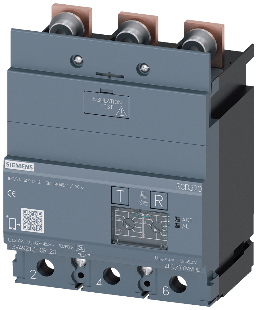 dispositivo di protezione differenziale RCD520 Basic RCD Tipo A montato in basso corrente di guasto nominale 0,03 ... 5 A a 50/60 Hz tempo regolabile 0 ... 3000 ms a 3 poli In=250A Ue=100-480V Accessori per: 3VA1 Interruttori automatici scatolati SENTRON 3VA - un sistema. Per tutte le applicazioni.