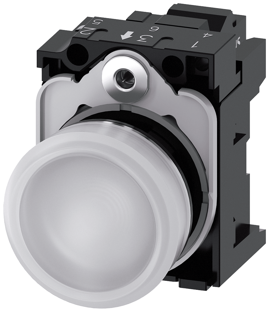 indicatore luminoso, 22 mm, rotondo, in metallo, lucido, bianco, lente, liscio, con supporto, modulo LED con LED integrato AC 110 V, morsetto a molla Indicatore luminoso SIRIUS ACT per la segnalazione di stati di commutazione o guasti in impianti, con forte intensità luminosa grazie alla tecnologia LED ad efficienza energetica. Siemens offre, sotto il nome commerciale SIRIUS ACT, un portfolio esclusivo di dispositivi di comando e segnalazione con omologazioni di prodotto per il mercato mondiale in tre moderne serie di design in robusto metallo puro e plastica pregiata.L'innovativo concetto di innesto a scatto semplifica talmente il montaggio che per eseguirlo basta una sola mano e non servono attrezzi speciali. Per i fori di montaggio sono sufficienti semplici fori non scanalati, essendo già integrata una protezione antirotazione al 100 %.Grazie al grado di protezione elevato i robusti apparecchi sono adatti all'impiego industriale e in ambiente esterno. È persino possibile la pulizia con getto ad alta pressione. Né polvere, né oli, né liscivia possono comprometterne il funzionamento affidabile.Oltre che con il cablaggio standard, gli apparecchi possono essere collegati al controllore anche tramite PROFINET, AS-Interface oppure IO-Link. Potete così ridurre il vostro onere di cablaggio, minimizzare le fonti di errore e ottenere maggiore flessibilità.Il configuratore online grafico supporta in modo confortevole la scelta e l'ordinazione di singoli apparecchi, pulsantiere e iscrizioni. È disponibile una documentazione completa (ad es. manuale, dati 3D, schema di collegamento). Esecuzioni fornibili: più colori, diverse varianti di tensione. Avvertenza: Apparecchio completo, fornitura incl. supporto e moduli. SIRIUS ACT - Performance in Action nel comando e nella segnalazione. Semplici da montare, altamente performanti, semplicemente perfetti.