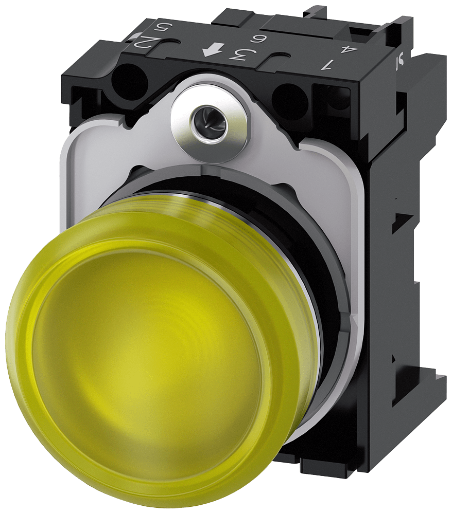 indicatore luminoso, 22 mm, rotondo, in metallo, lucido, giallo, lente, liscio, con supporto, modulo LED con LED integrato AC/DC 24V, morsetto a vite Indicatore luminoso SIRIUS ACT per la segnalazione di stati di commutazione o guasti in impianti, con forte intensità luminosa grazie alla tecnologia LED ad efficienza energetica. Siemens offre, sotto il nome commerciale SIRIUS ACT, un portfolio esclusivo di dispositivi di comando e segnalazione con omologazioni di prodotto per il mercato mondiale in tre moderne serie di design in robusto metallo puro e plastica pregiata.L'innovativo concetto di innesto a scatto semplifica talmente il montaggio che per eseguirlo basta una sola mano e non servono attrezzi speciali. Per i fori di montaggio sono sufficienti semplici fori non scanalati, essendo già integrata una protezione antirotazione al 100 %.Grazie al grado di protezione elevato i robusti apparecchi sono adatti all'impiego industriale e in ambiente esterno. È persino possibile la pulizia con getto ad alta pressione. Né polvere, né oli, né liscivia possono comprometterne il funzionamento affidabile.Oltre che con il cablaggio standard, gli apparecchi possono essere collegati al controllore anche tramite PROFINET, AS-Interface oppure IO-Link. Potete così ridurre il vostro onere di cablaggio, minimizzare le fonti di errore e ottenere maggiore flessibilità.Il configuratore online grafico supporta in modo confortevole la scelta e l'ordinazione di singoli apparecchi, pulsantiere e iscrizioni. È disponibile una documentazione completa (ad es. manuale, dati 3D, schema di collegamento). Esecuzioni fornibili: più colori, diverse varianti di tensione. Avvertenza: Apparecchio completo, fornitura incl. supporto e moduli. SIRIUS ACT - Performance in Action nel comando e nella segnalazione. Semplici da montare, altamente performanti, semplicemente perfetti.