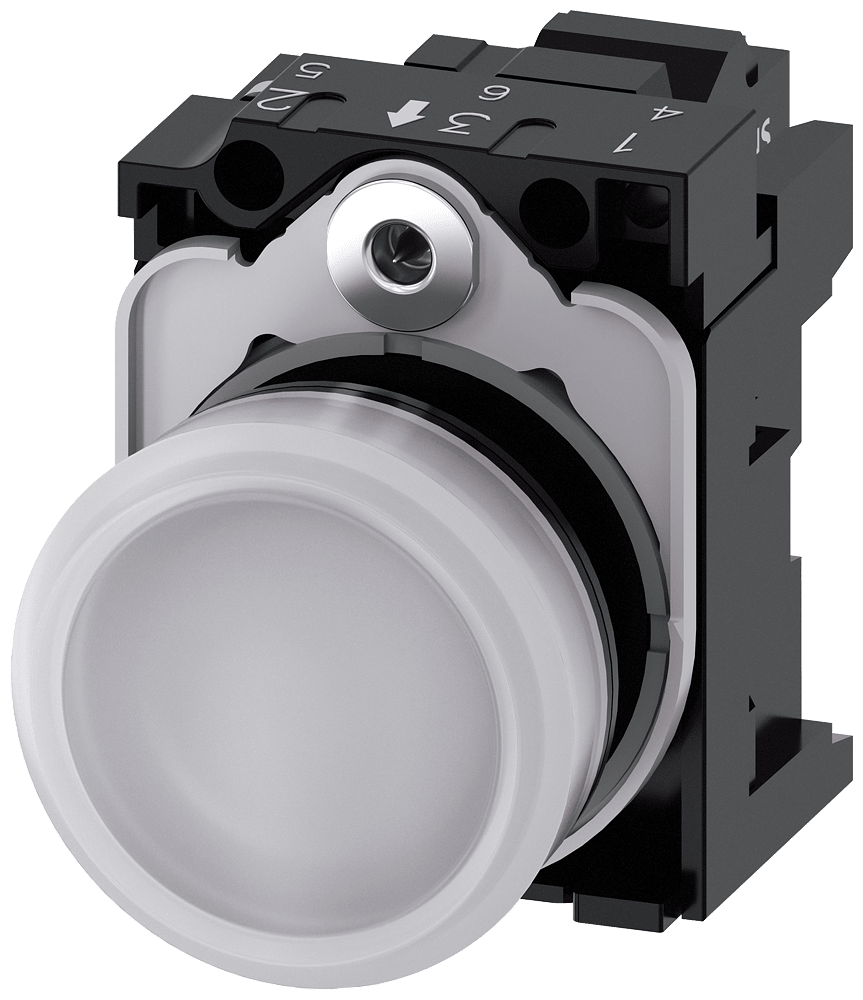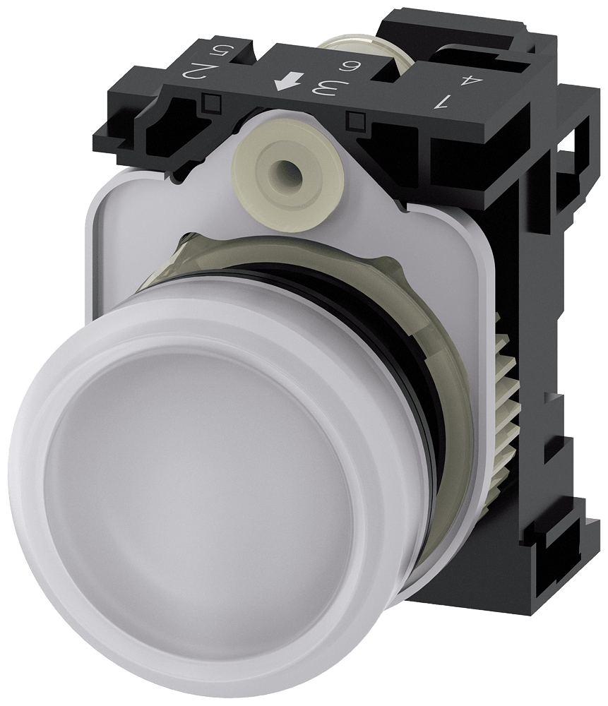 indicatore luminoso, 22 mm, rotondo, in plastica, bianco, lente, liscio, con supporto, modulo LED, con LED integrato AC 230 V, morsetto a molla Indicatore luminoso SIRIUS ACT per la segnalazione di stati di commutazione o guasti in impianti, con forte intensità luminosa grazie alla tecnologia LED ad efficienza energetica. Siemens offre, sotto il nome commerciale SIRIUS ACT, un portfolio esclusivo di dispositivi di comando e segnalazione con omologazioni di prodotto per il mercato mondiale in tre moderne serie di design in robusto metallo puro e plastica pregiata.L'innovativo concetto di innesto a scatto semplifica talmente il montaggio che per eseguirlo basta una sola mano e non servono attrezzi speciali. Per i fori di montaggio sono sufficienti semplici fori non scanalati, essendo già integrata una protezione antirotazione al 100 %.Grazie al grado di protezione elevato i robusti apparecchi sono adatti all'impiego industriale e in ambiente esterno. È persino possibile la pulizia con getto ad alta pressione. Né polvere, né oli, né liscivia possono comprometterne il funzionamento affidabile.Oltre che con il cablaggio standard, gli apparecchi possono essere collegati al controllore anche tramite PROFINET, AS-Interface oppure IO-Link. Potete così ridurre il vostro onere di cablaggio, minimizzare le fonti di errore e ottenere maggiore flessibilità.Il configuratore online grafico supporta in modo confortevole la scelta e l'ordinazione di singoli apparecchi, pulsantiere e iscrizioni. È disponibile una documentazione completa (ad es. manuale, dati 3D, schema di collegamento). Esecuzioni fornibili: più colori, diverse varianti di tensione. Avvertenza: Apparecchio completo, fornitura incl. supporto e moduli. SIRIUS ACT - Performance in Action nel comando e nella segnalazione. Semplici da montare, altamente performanti, semplicemente perfetti.