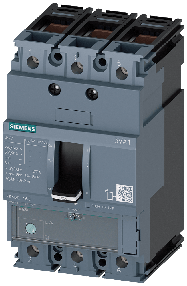 interruttore automatico 3VA1 IEC frame 160 classe del potere di interruzione S Icu=36kA con 415V a 3 poli, protezione impianto TM220, ATFM, In=16A protezione da sovraccarico Ir=11A...16A protezione da cortocircuito Ii=20 x In connessione a morsetto Interruttore automatico scatolato SENTRON 3VA1 per una protezione impianto efficace grazie alla disinserzione sicura in caso di sovraccarico e cortocircuito. Gli interruttori automatici scatolati 3VA fissano standard di riferimento per quanto riguarda flessibilità e varietà di elementi modulari con ingombro ridotto. Gli interruttori automatici scatolati 3VA1 sono disponibili in esecuzione a 1, 2, 3 e 4 poli con diverse correnti permanenti nominali per il montaggio in esecuzione fissa nonché in esecuzione rimovibile/estraibile. Gli accessori modulari e facili da installare, con un'ampia gamma di funzioni, sono omogenei per tutte le grandezze costruttive e tutte le serie costruttive di interruttori automatici scatolati 3VA. Interruttori automatici scatolati SENTRON 3VA - un sistema. Per tutte le applicazioni.