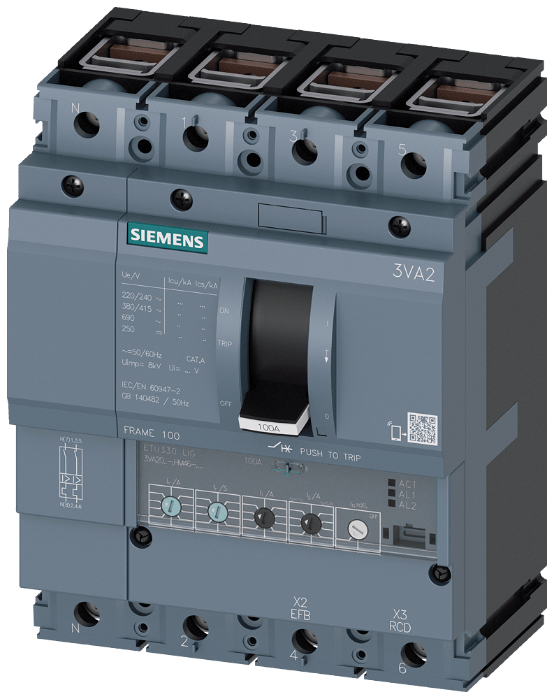 interruttore automatico 3VA2 IEC frame 100 classe del potere di interruzione H Icu=85kA con 415V a 4 poli, protezione impianto ETU330, LIG, In=63A protezione da sovraccarico Ir=25A...63A protezione da cortocircuito Ii=1,5...12 x In protezione del conduttore di neutro impostabile (OFF, 100%) protezione da guasto verso terra Ig=0,25...1 x In= tg=0,1/0,3s connessione a morsetto Interruttore automatico scatolato SENTRON 3VA2 per una protezione impianto efficace grazie alla disinserzione sicura in caso di sovraccarico e cortocircuito. Gli interruttori automatici scatolati 3VA fissano standard di riferimento per quanto riguarda flessibilità e varietà di elementi modulari con ingombro ridotto. Gli interruttori automatici scatolati 3VA2 sono disponibili in esecuzione a 3 e 4 poli con diverse correnti permanenti nominali per il montaggio in esecuzione fissa nonché in esecuzione rimovibile/estraibile. Gli accessori modulari e facili da installare, con un'ampia gamma di funzioni, sono omogenei per tutte le grandezze costruttive e tutte le serie costruttive di interruttori automatici scatolati 3VA. Interruttori automatici scatolati SENTRON 3VA - un sistema. Per tutte le applicazioni.