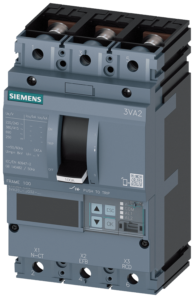 SIEMENS - interruttore automatico 3VA2 IEC frame 100 classe del potere di interruzione L Icu=150kA con 415V a 3 poli, protezione impianto ETU560, LSIG, In=10... 3VA20108JQ320AA0